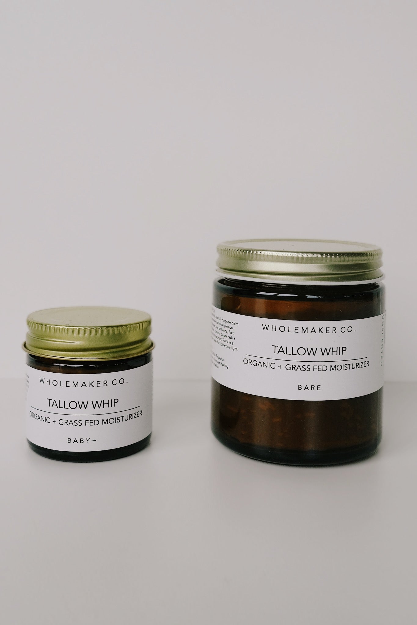 tallow is made by rendering suet (the hard, white fat around the kidneys of an animal). wholemaker's tallow is sourced from family farms that raise organic, pasture-raised, grass-fed + finished beef.