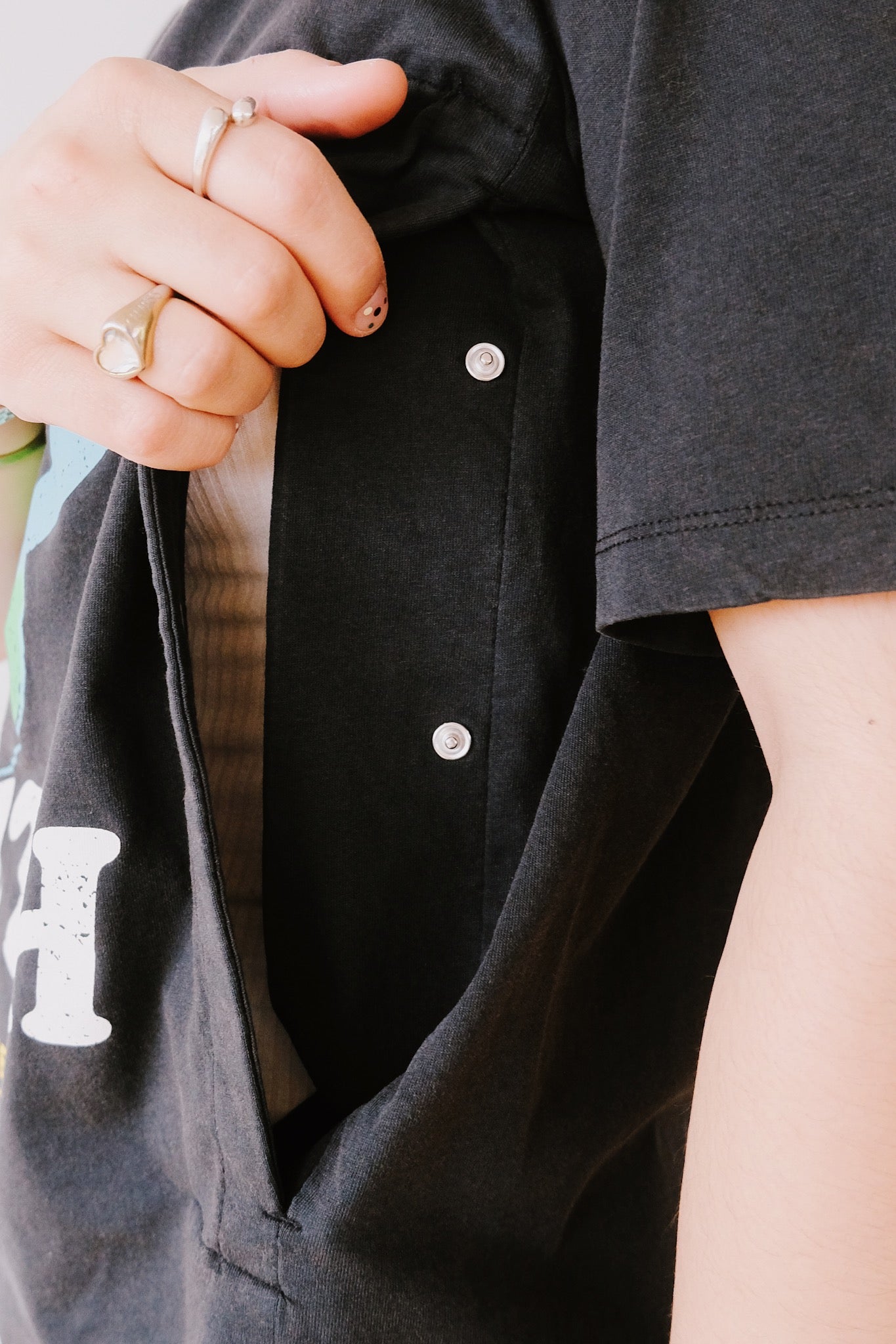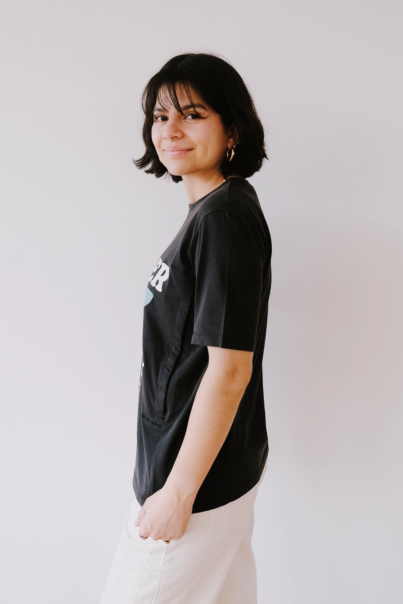 This breastfeeding T-shirt, made from 100% soft cotton jersey, is designed for comfort and ease during pregnancy and nursing. Featuring double openings with zips for quick access and a statement print. The fabric is slightly faded - making this t-shirt look like a vintage piece.