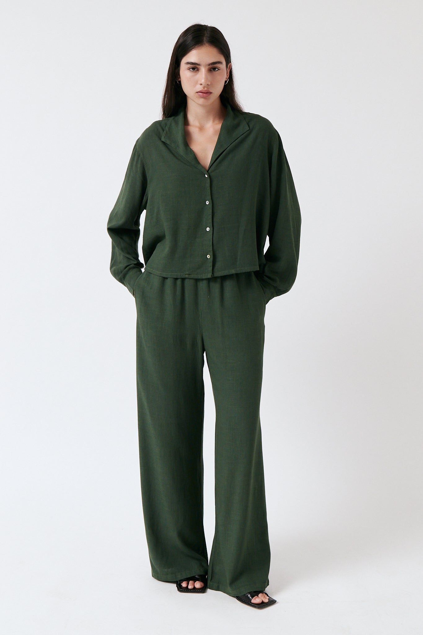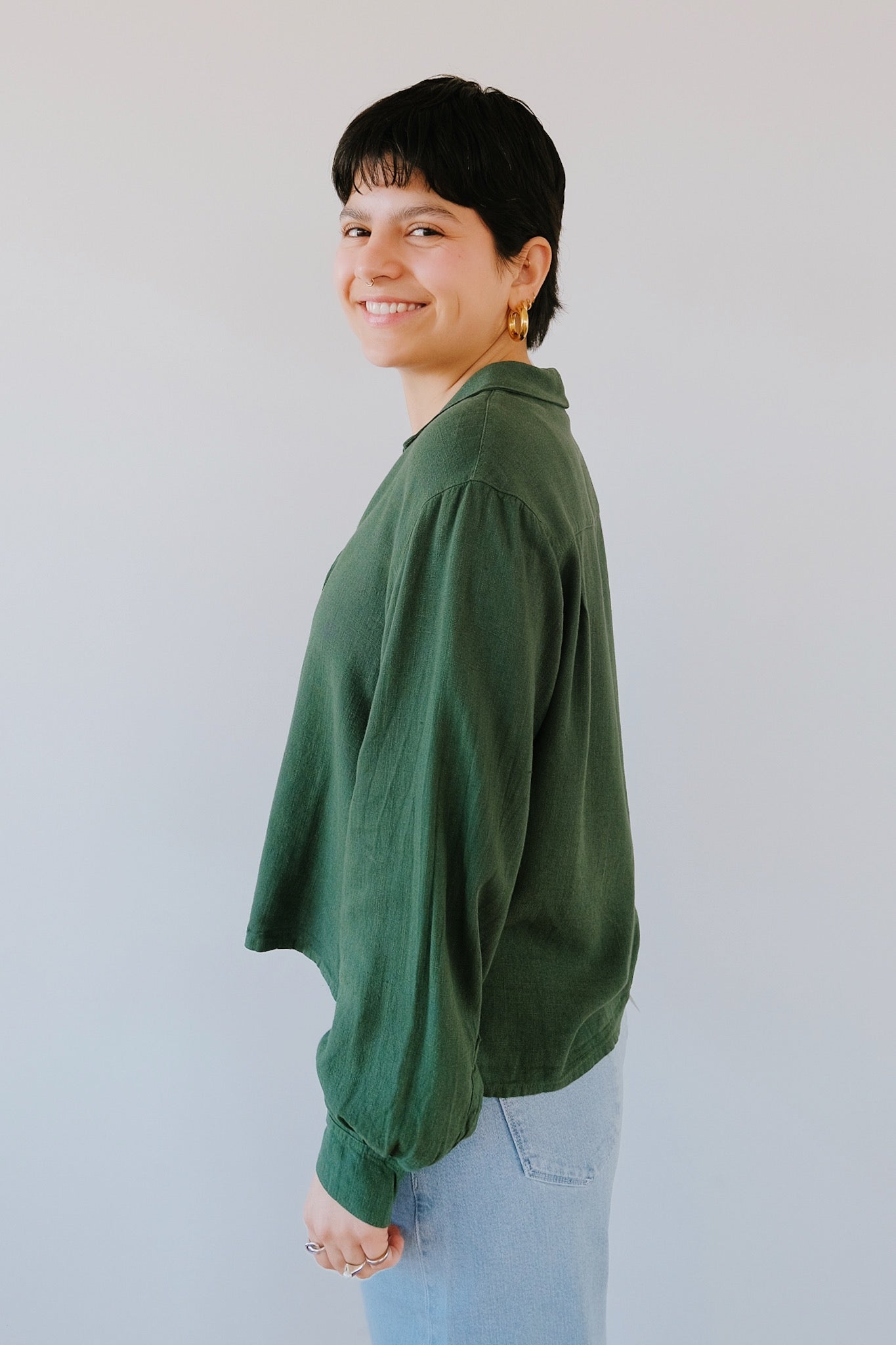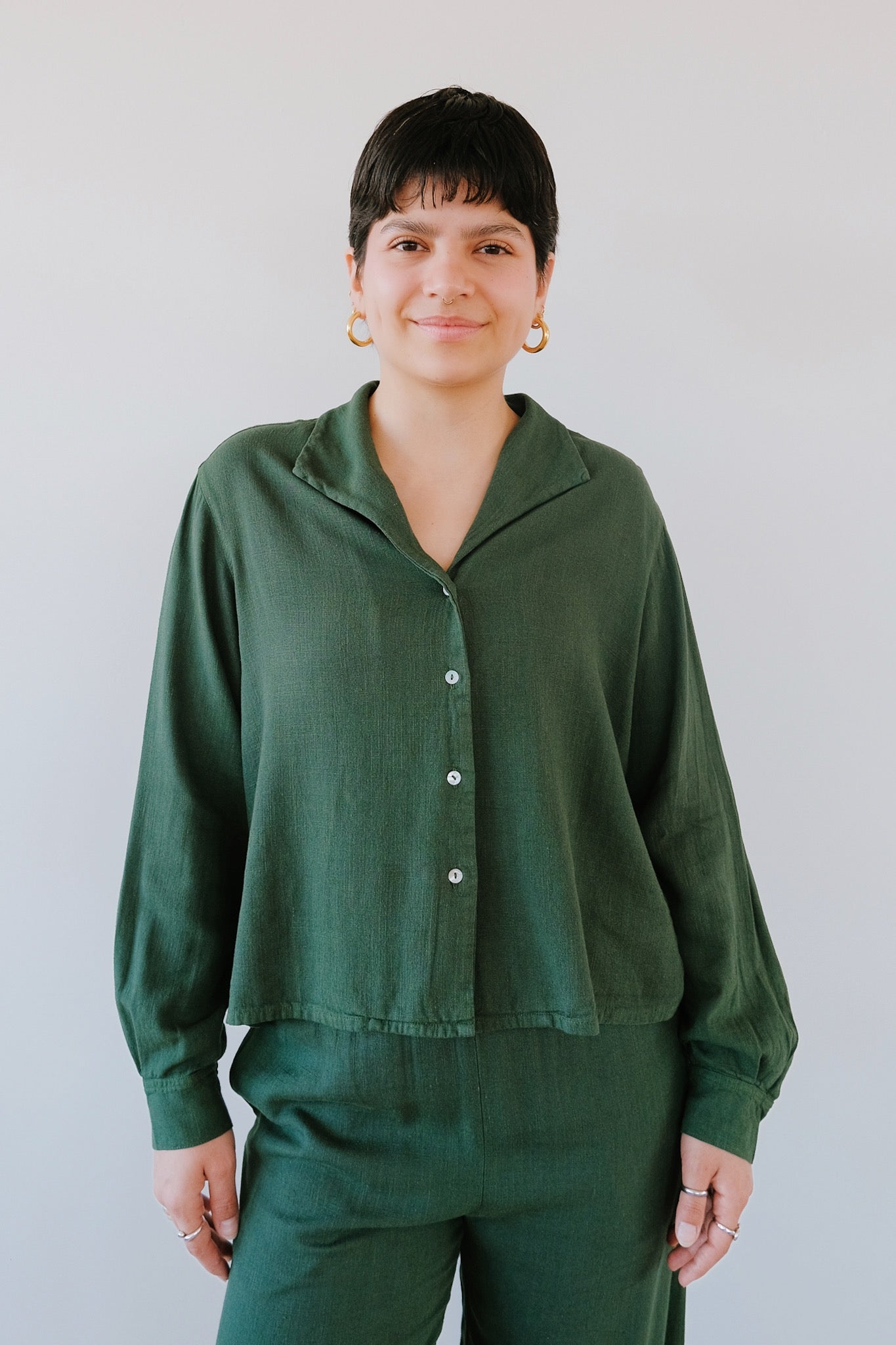 Looking for a shirt that is breathable, flowy, comfortable and still elegant? This is it! Also, we have the matching pants if you're looking to feel all over comfort. This beautiful dark green works perfect for both casual and dressy occasions. We love it!
