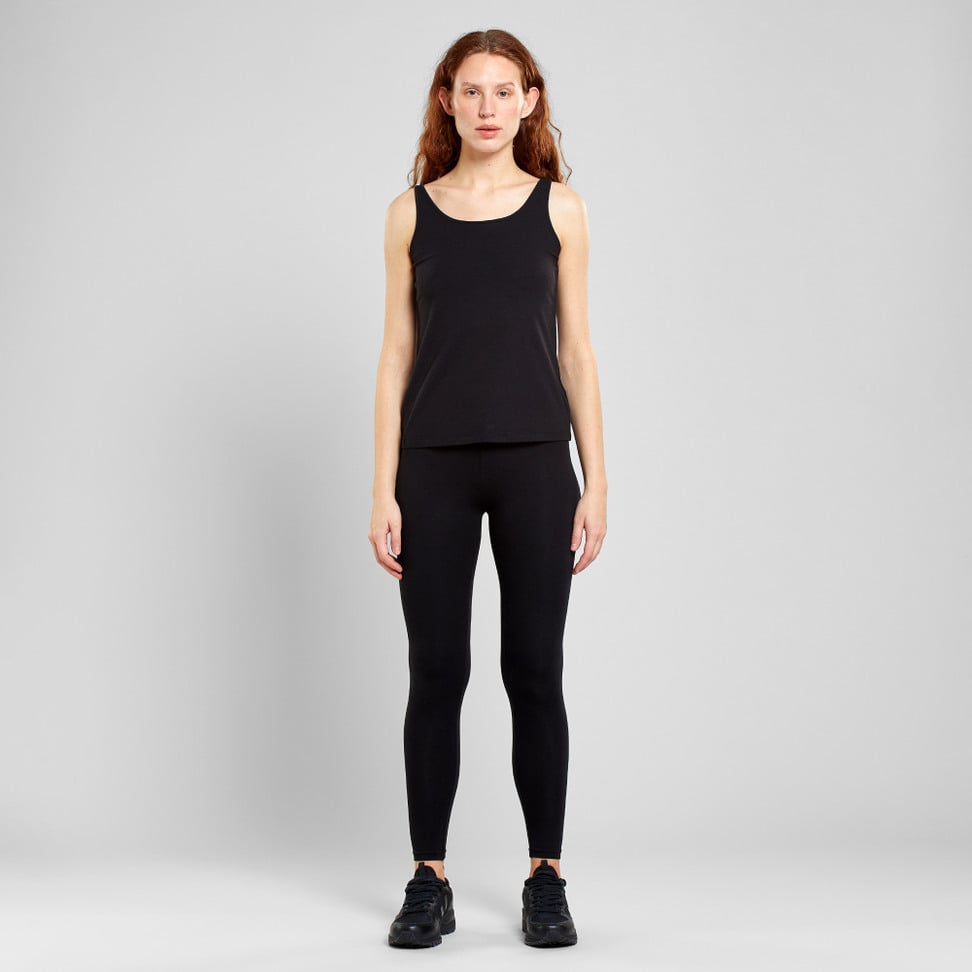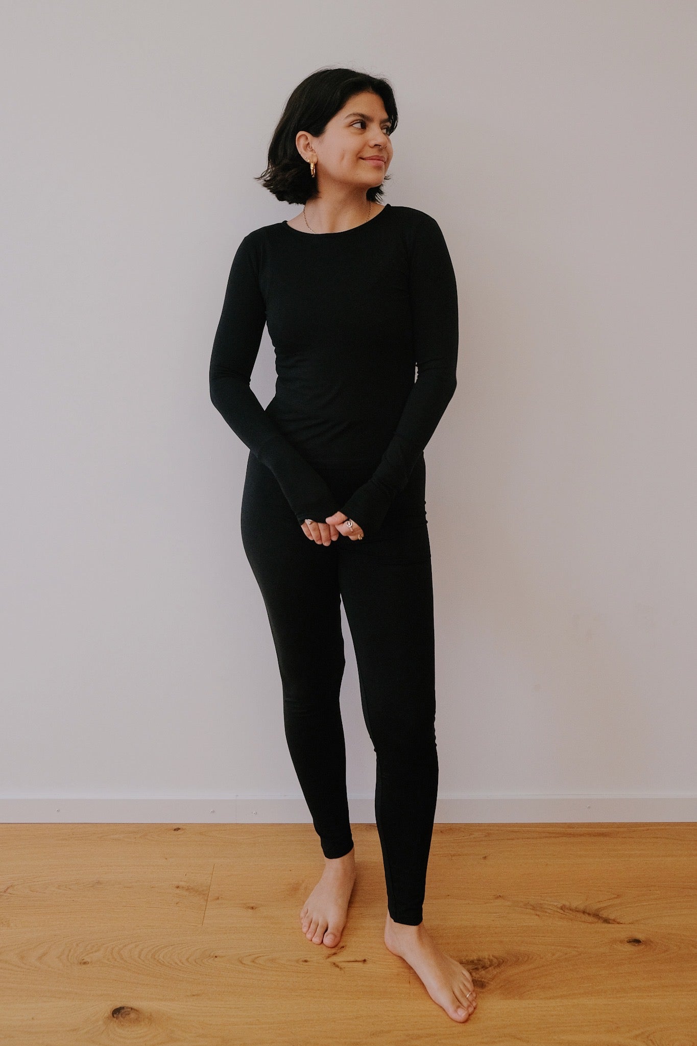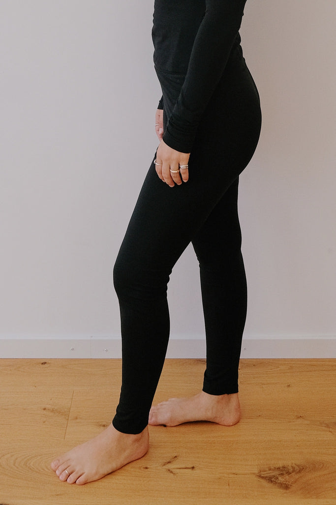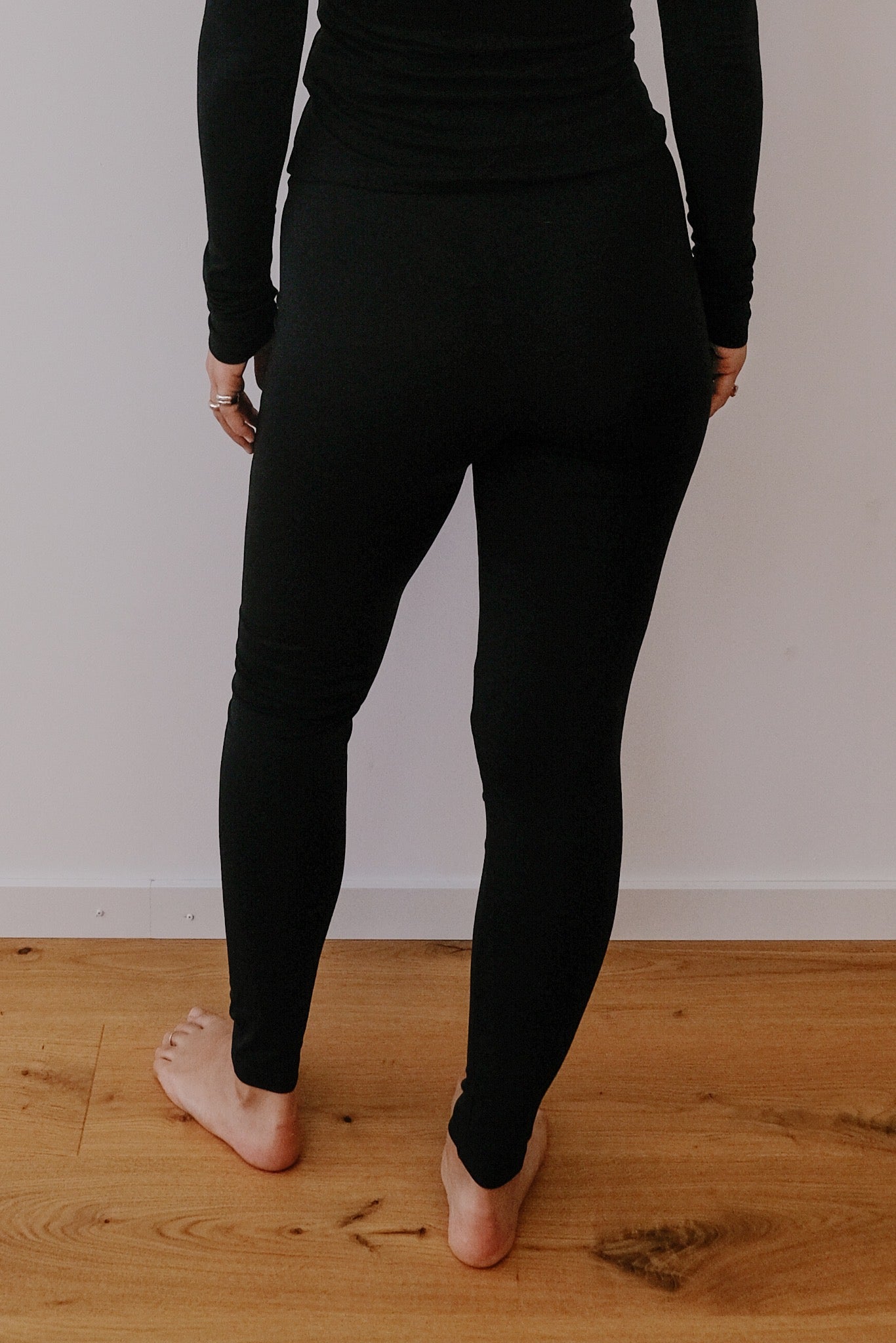 Stay cozy and stylish with these full-length leggings, crafted from a soft blend of organic cotton and sustainable TENCEL™ Lyocell. Designed with a high waist for extra comfort, they hug your legs perfectly while giving you freedom to move. Whether you're lounging or on the go, these black leggings add a comfy layer to your everyday look.