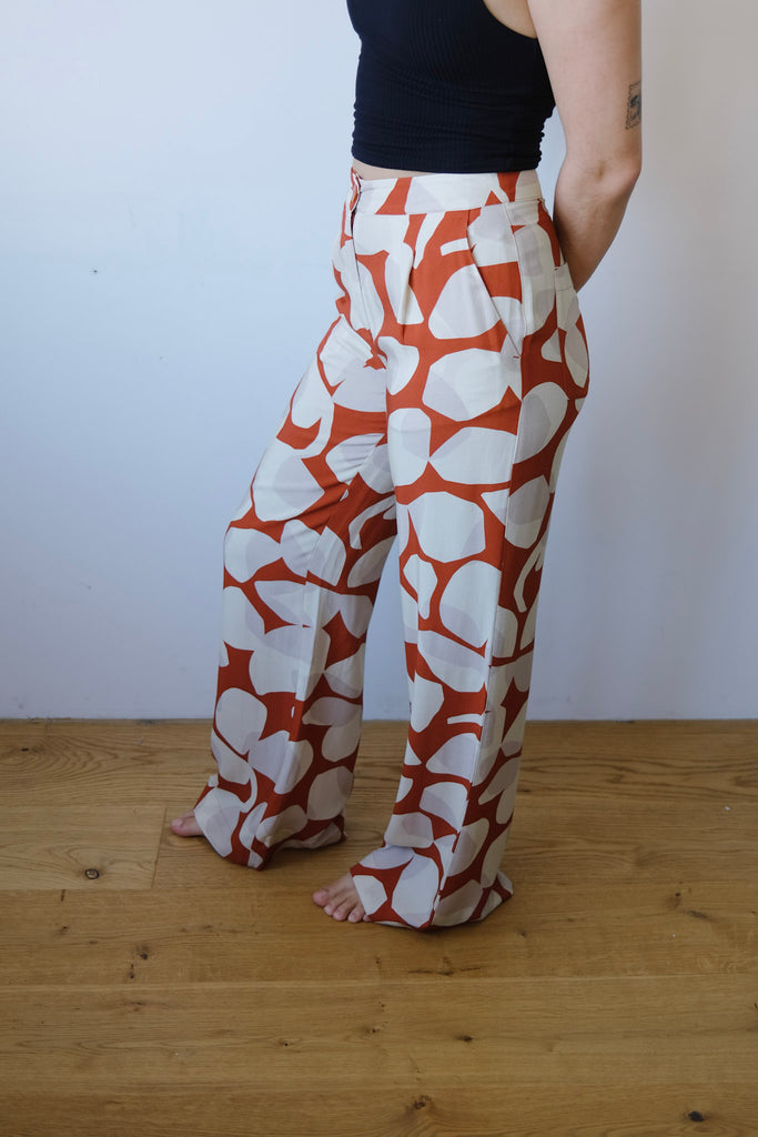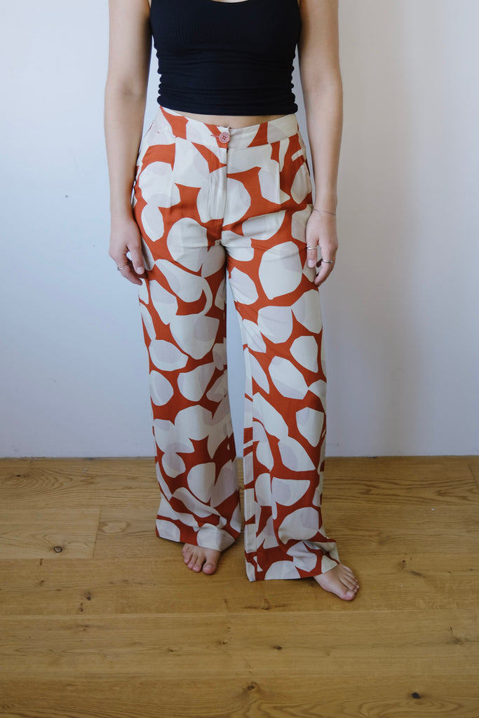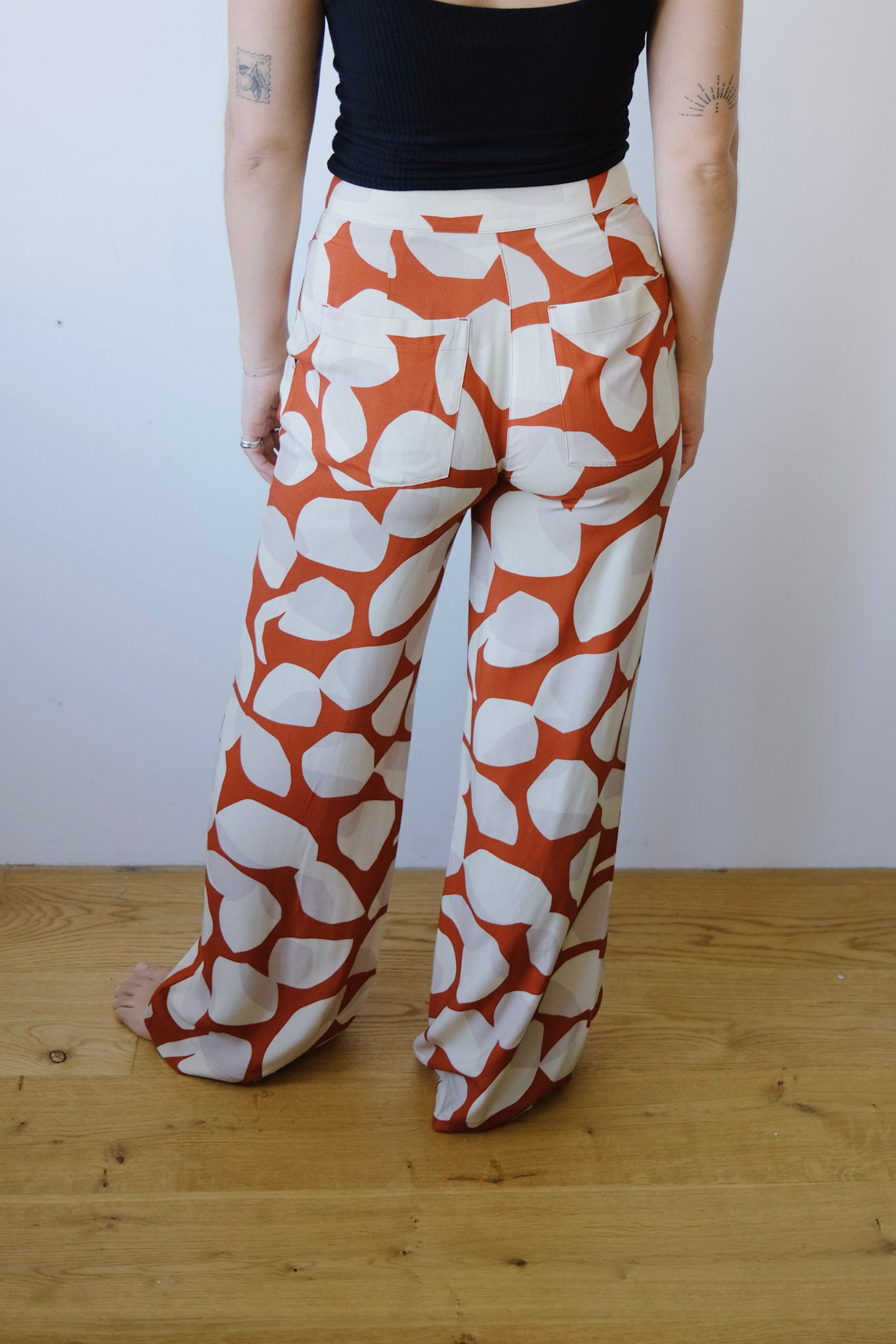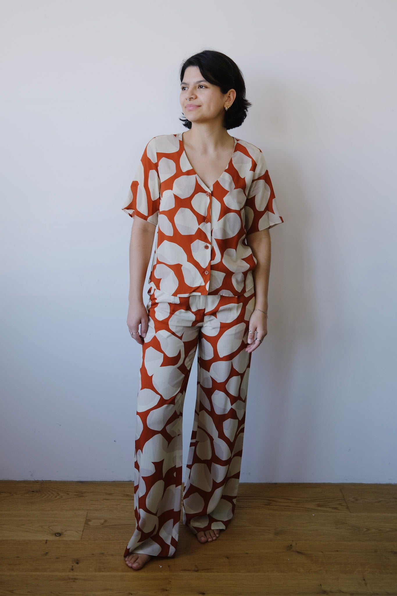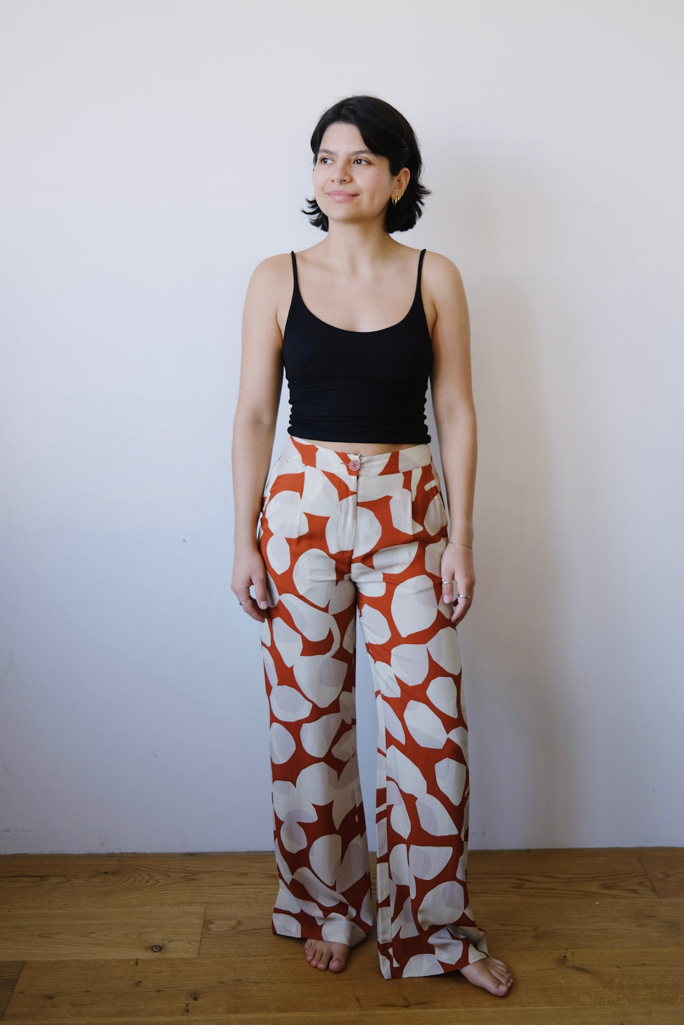 step into style with these ecovero pants in a playful light leaf pattern. made from breathable fabric, these pants keep you cool and comfortable all day. mix and match with the coordinating blouse for a unique all-over look.