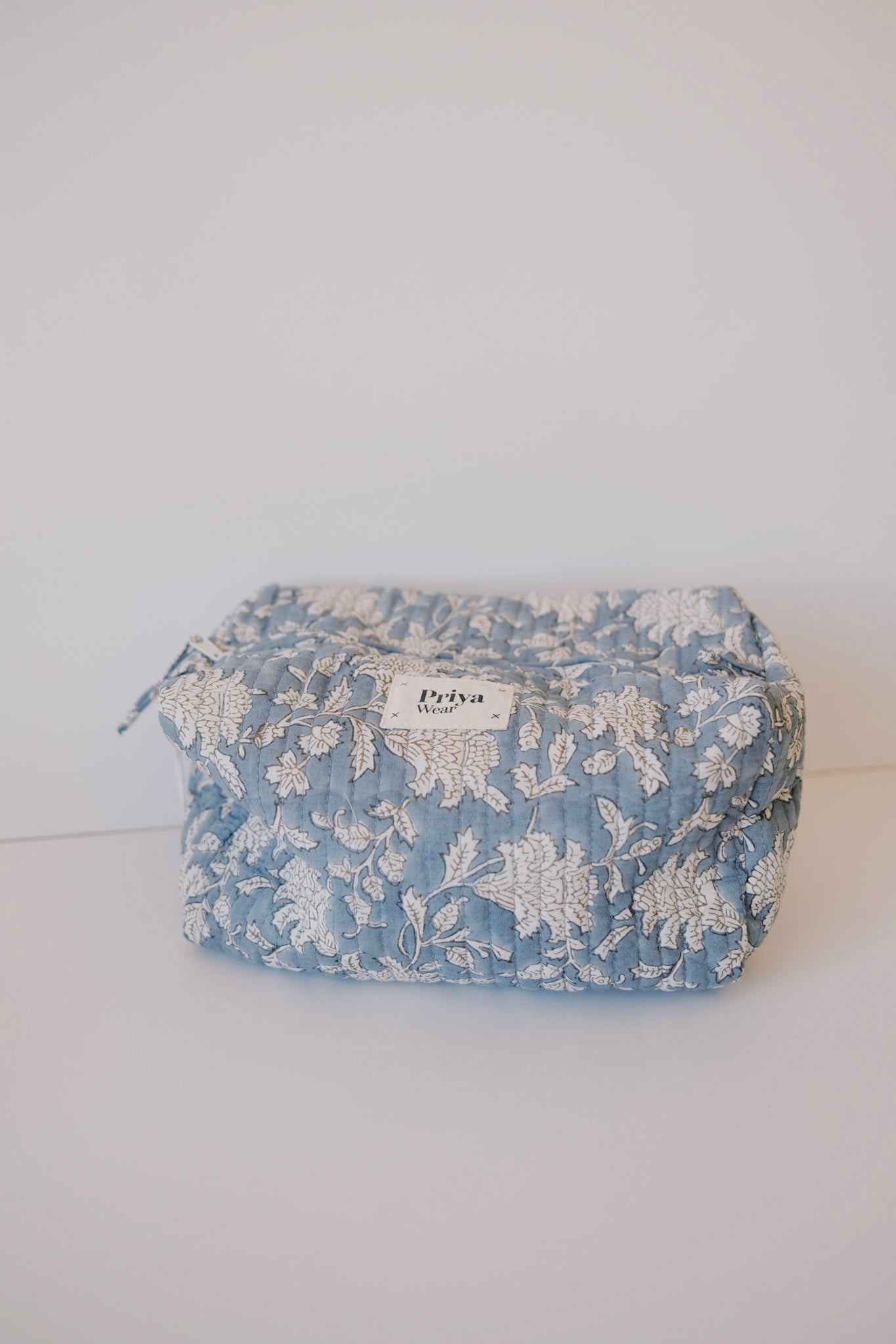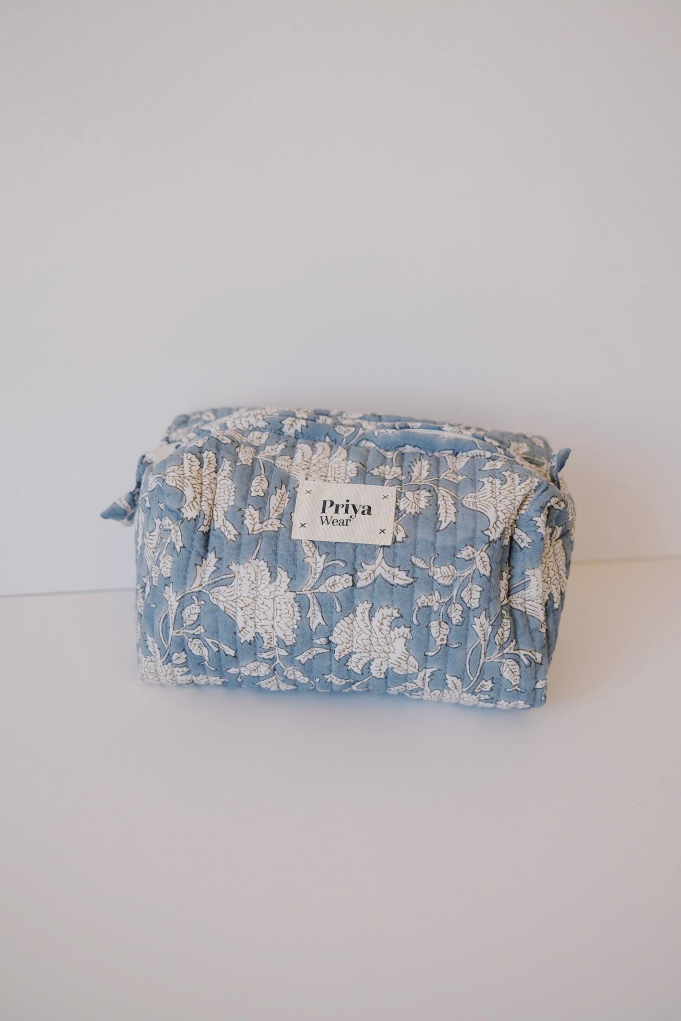 these beauty bags are truly special. they are made from left over fabrics from the priya pyjamas. they are hand block-printed.