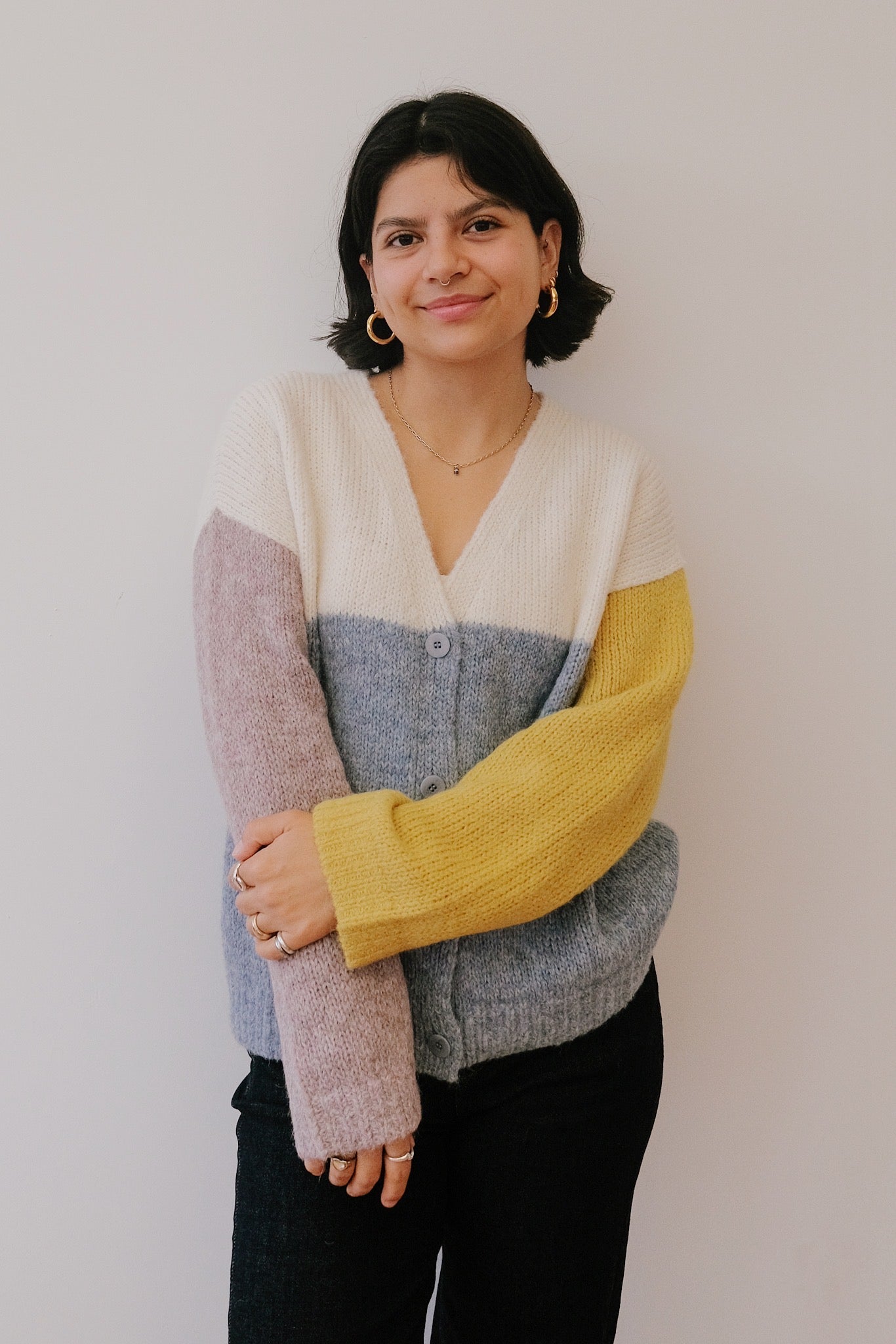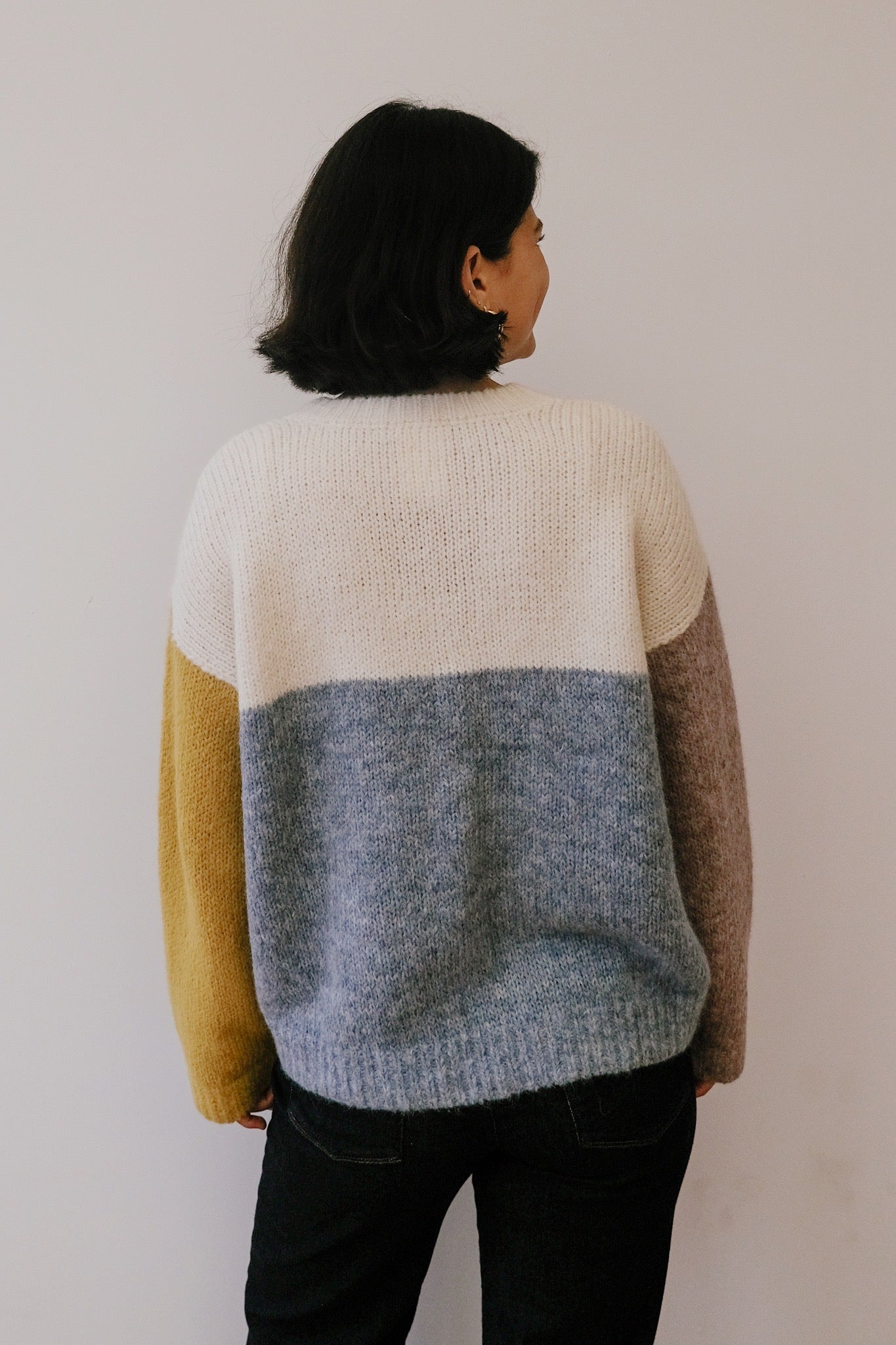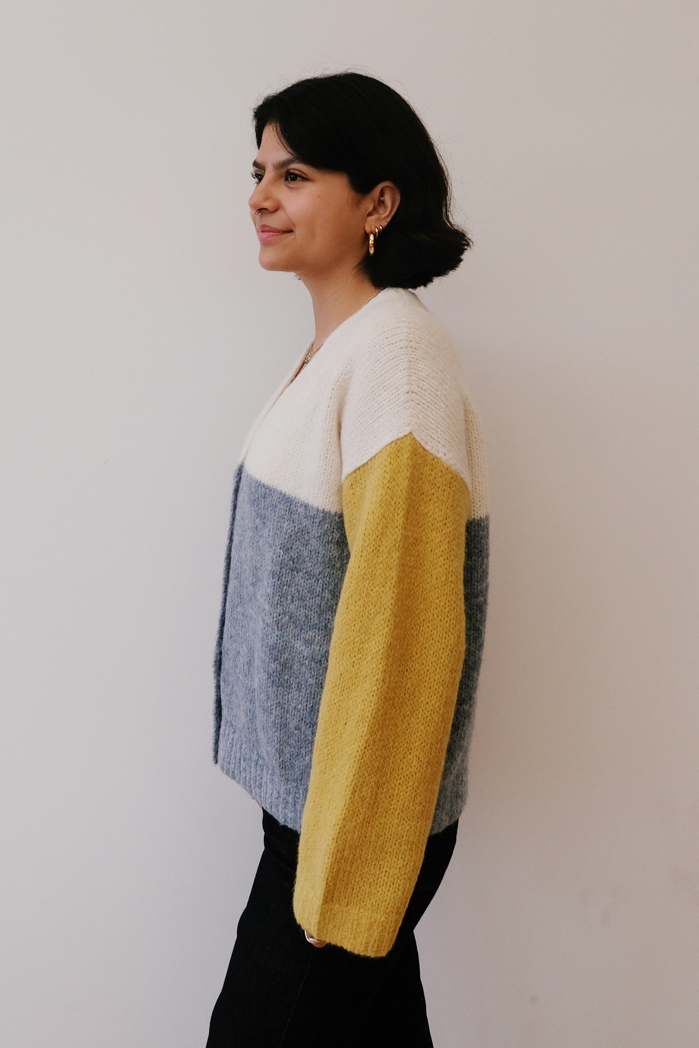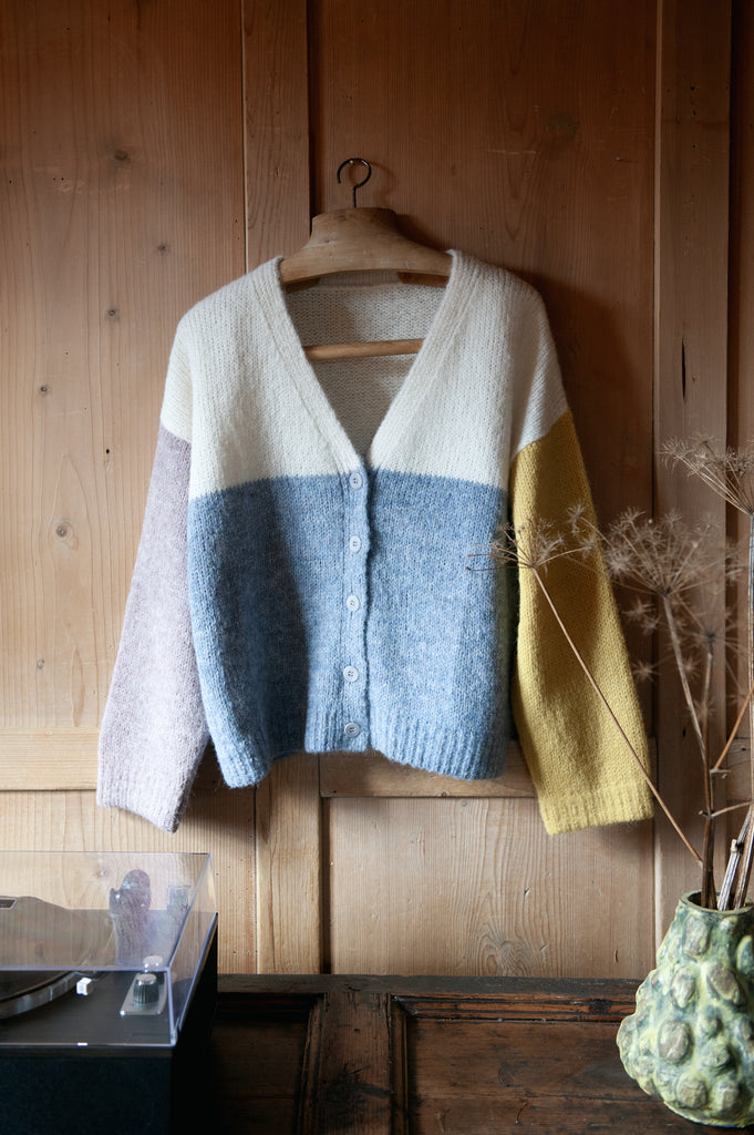 Bleib kuschelig mit diesem verspielten, kurzen, kastig geschnittenen Cardigan mit kräftigen Farbblöcken, die an blauen Himmel und strahlende Sonne erinnern. Hergestellt aus superfeinem Alpaka, fühlt er sich unglaublich weich und kuschelig auf der Haut an. Perfekt für den Lagenlook, setzt dieser leichte Strick einen lustigen Farbtupfer und hält dich gleichzeitig angenehm warm.