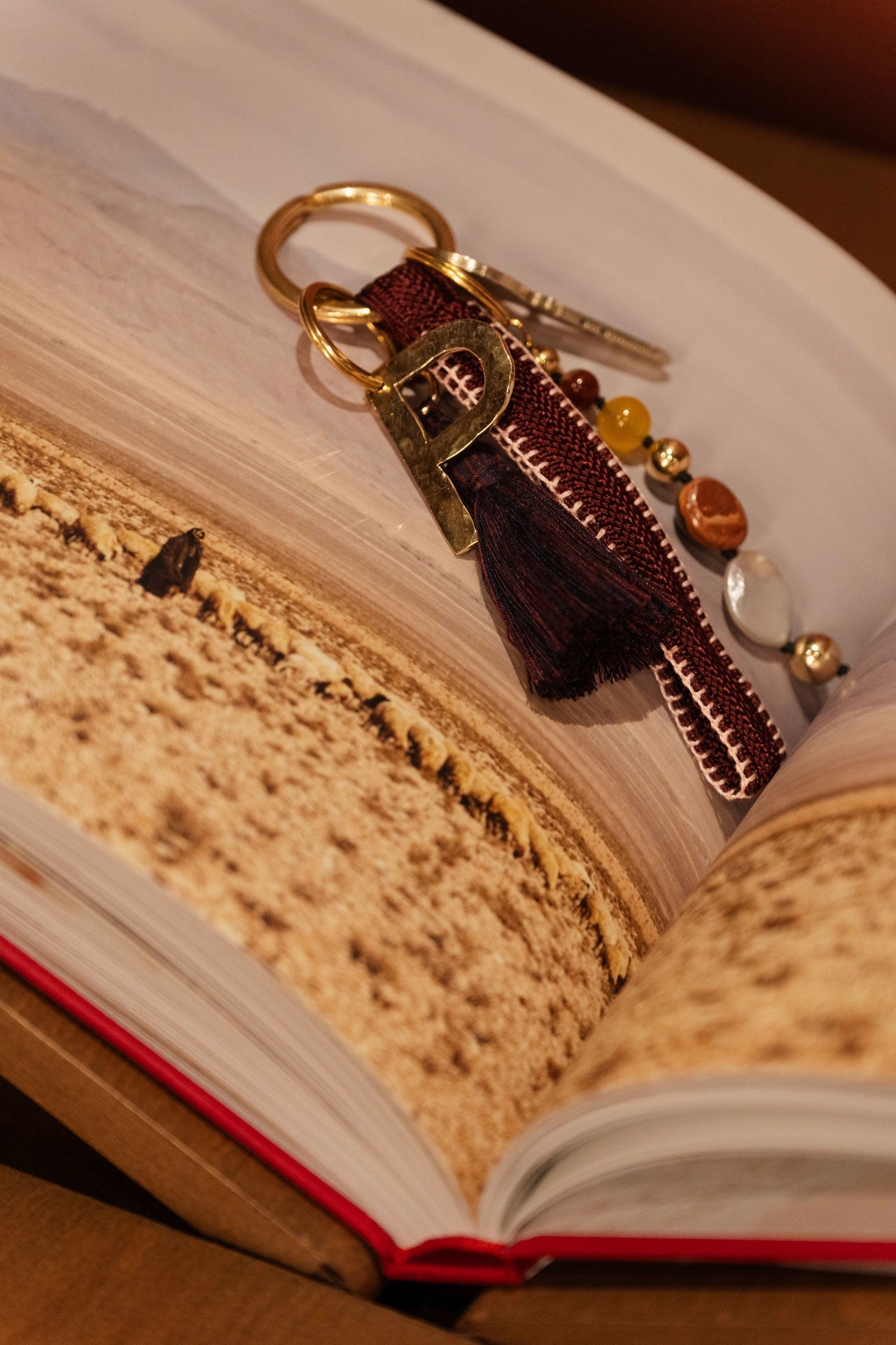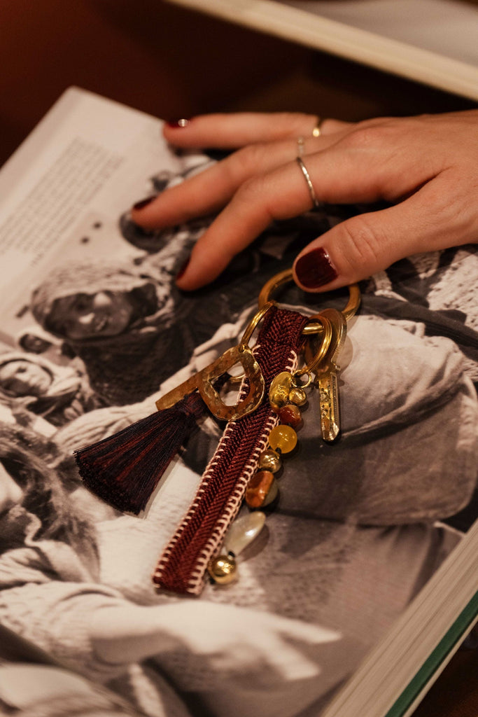 this keychain is made from a moroccan ribbon called sfifa, which is traditionally used to decorate elegant kaftans. the process begins with sabra threads, which are braided into sfifa on the outskirts of marrakech, using an antique machine. step by step, the threads are transformed into this unique keychain.
