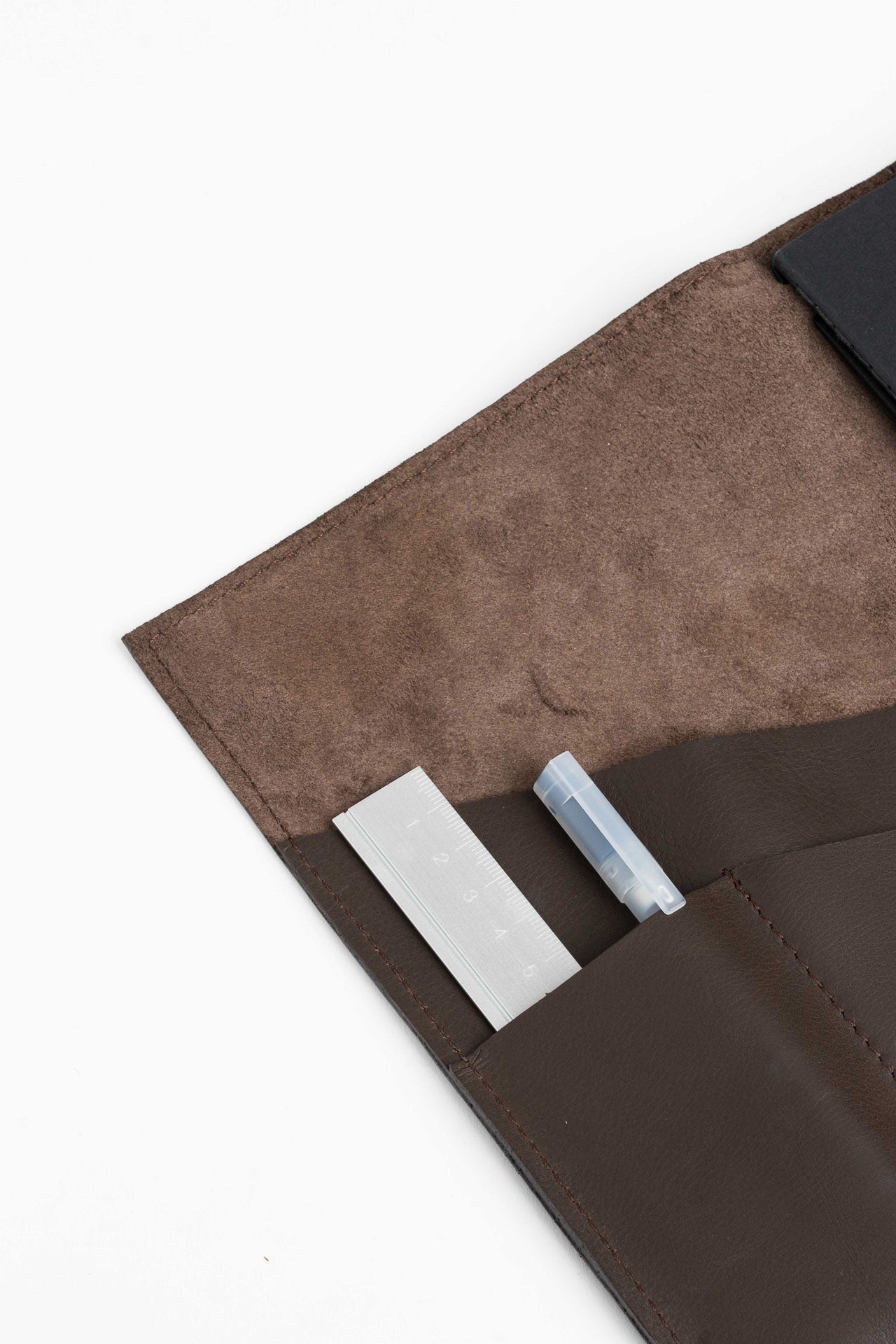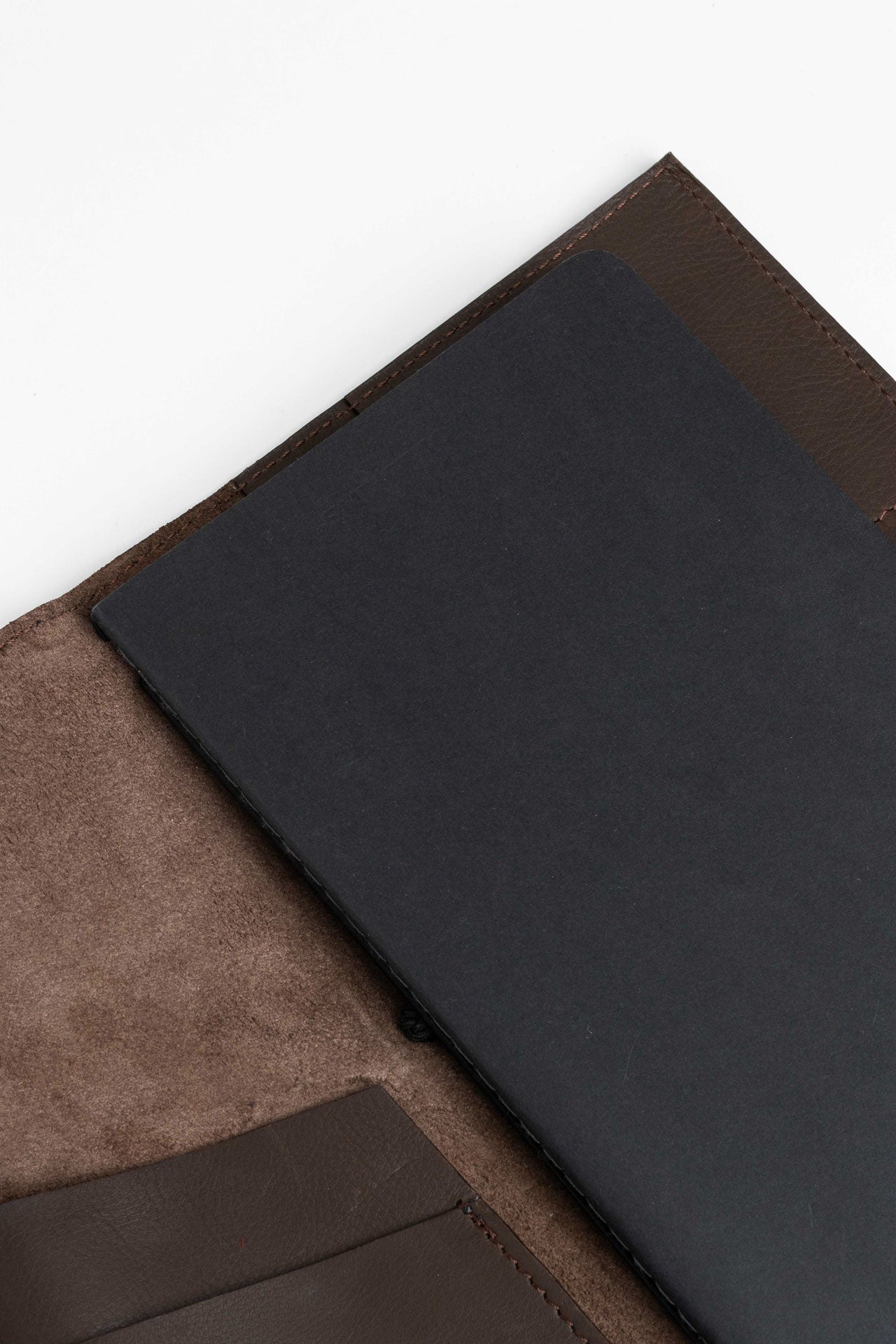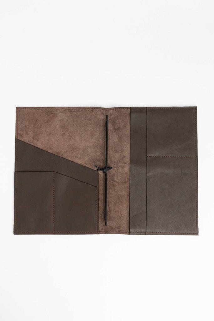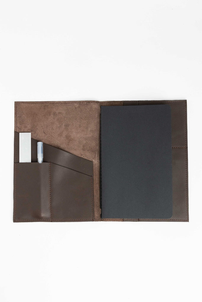 This leather cover holds your notebook, planner, or sketchbook with care. thoughtfully designed compartments offer space for pens, cards, and other essentials – keeping everything you need close at hand, whether you're at work, on the go, or in a creative flow.