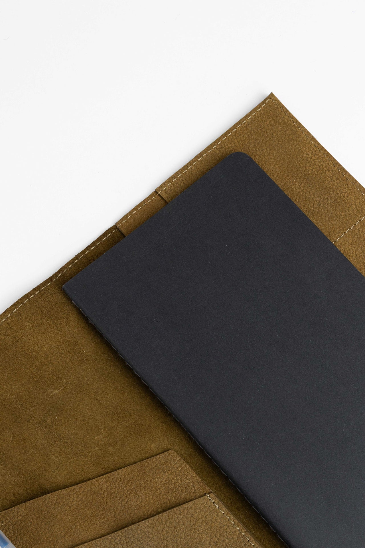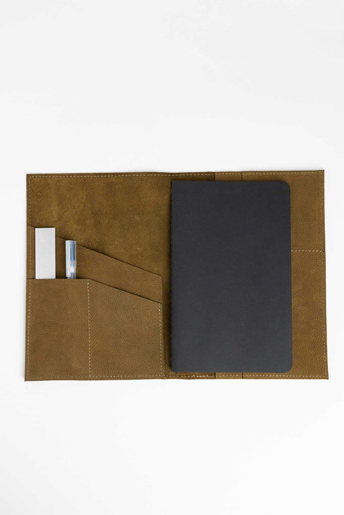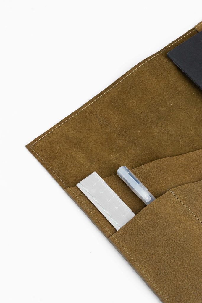 this leather cover holds your notebook, planner, or sketchbook with care. thoughtfully designed compartments offer space for pens, cards, and other essentials – keeping everything you need close at hand, whether you're at work, on the go, or in a creative flow.