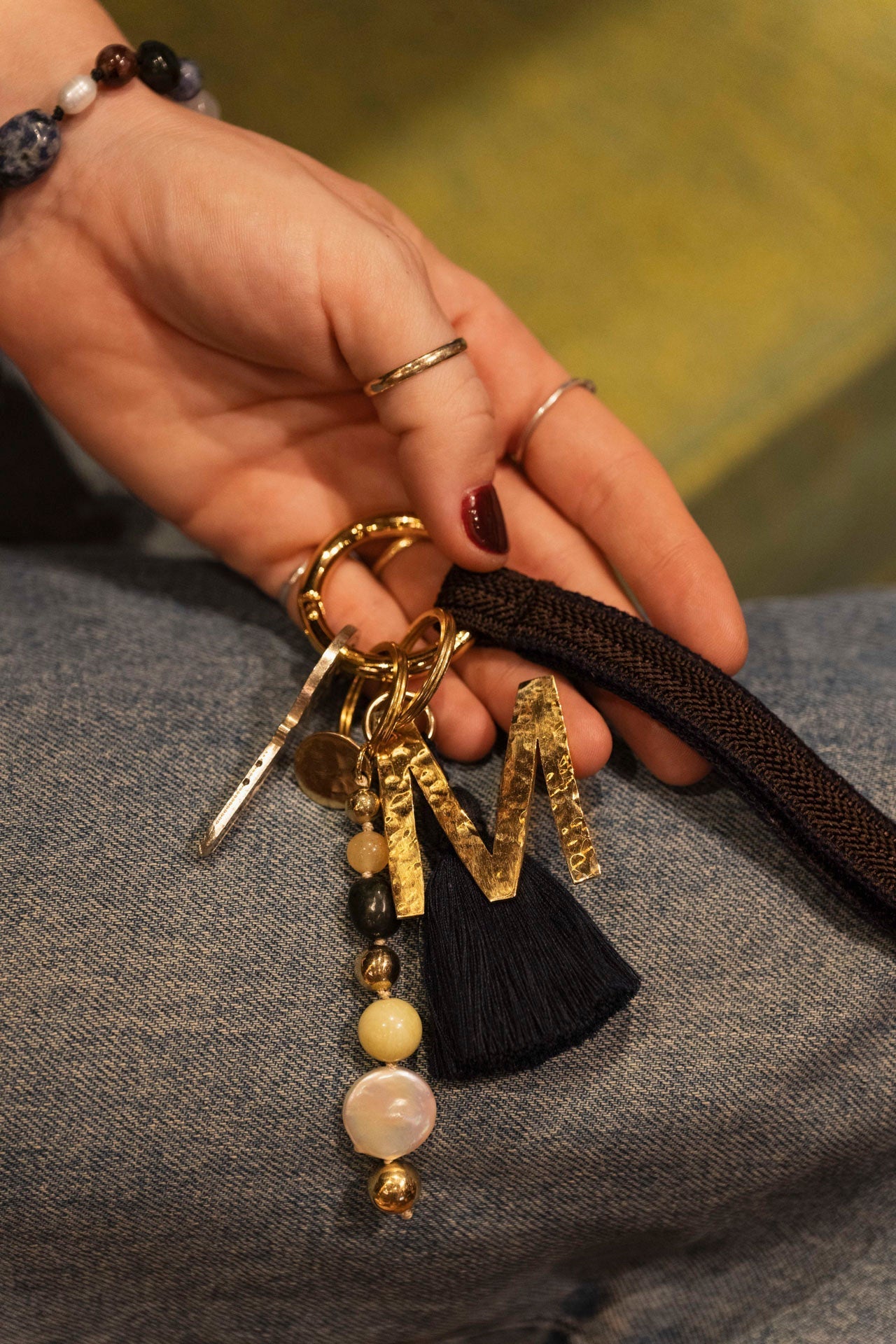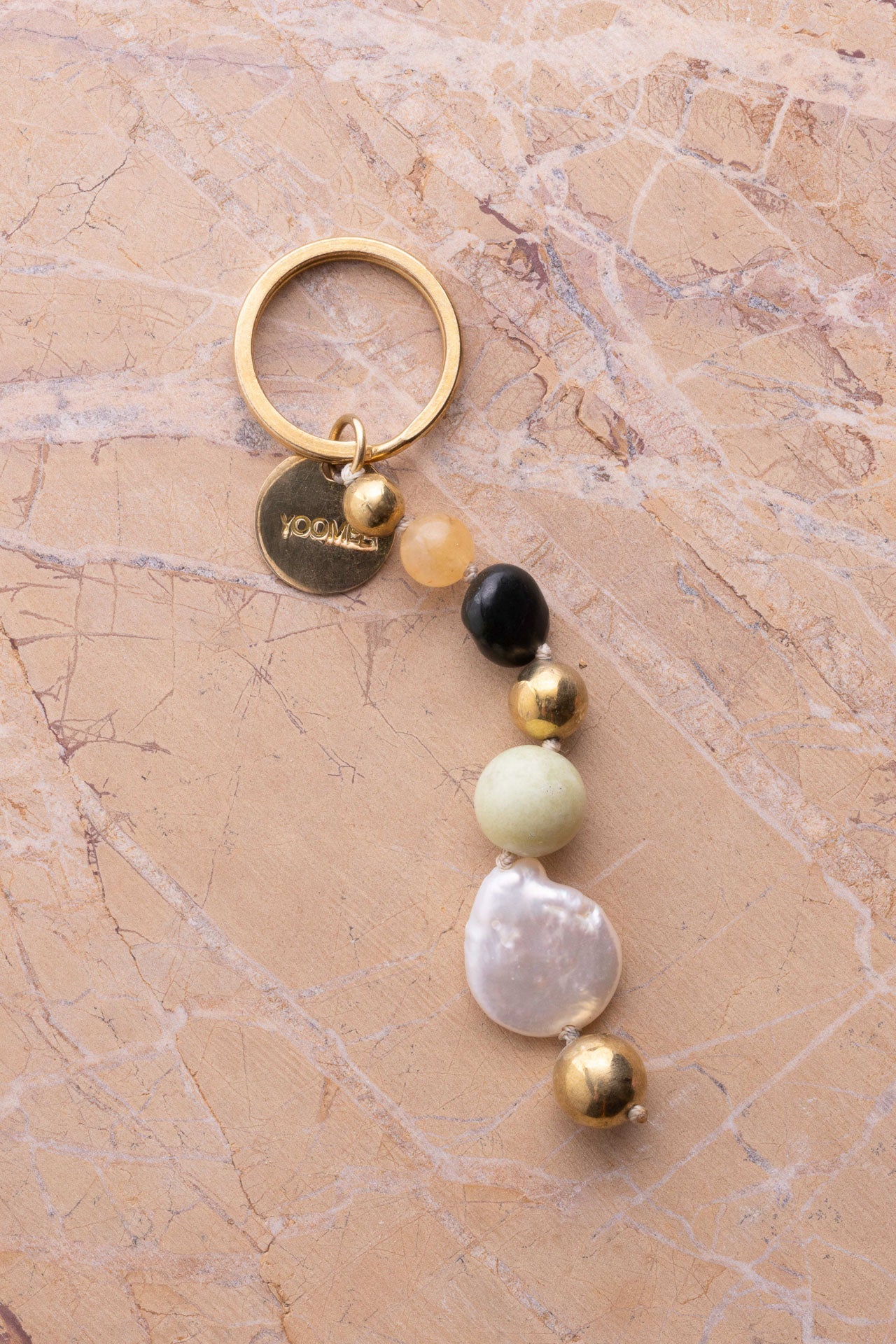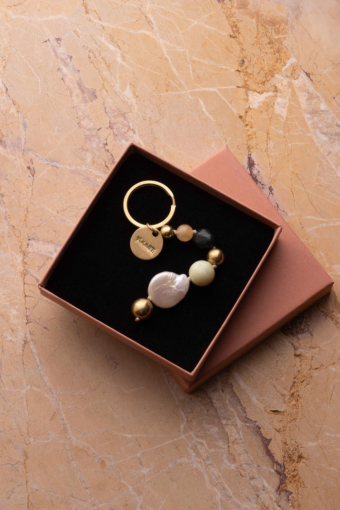 The JAMILA pendant is a unique accessory that brings together natural elegance and traditional craftsmanship. Whether used as a bag charm or keychain, it features real semi-precious stones, a lustrous large pearl, and handcrafted brass beads made in marrakech.