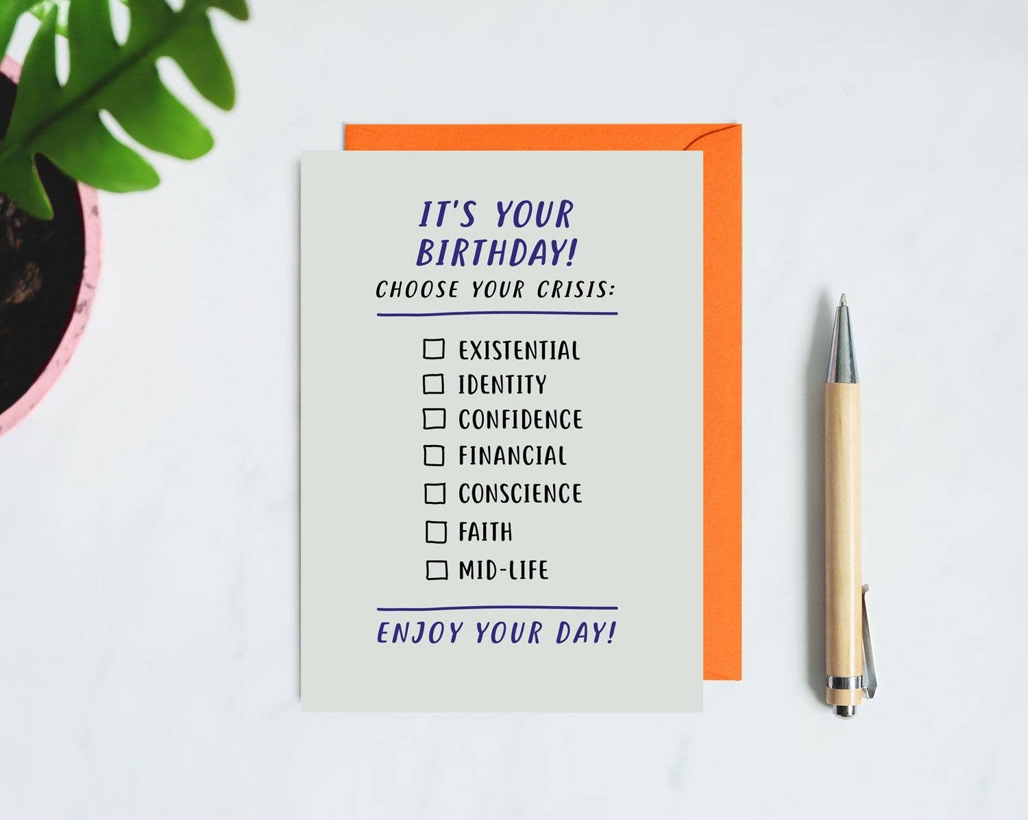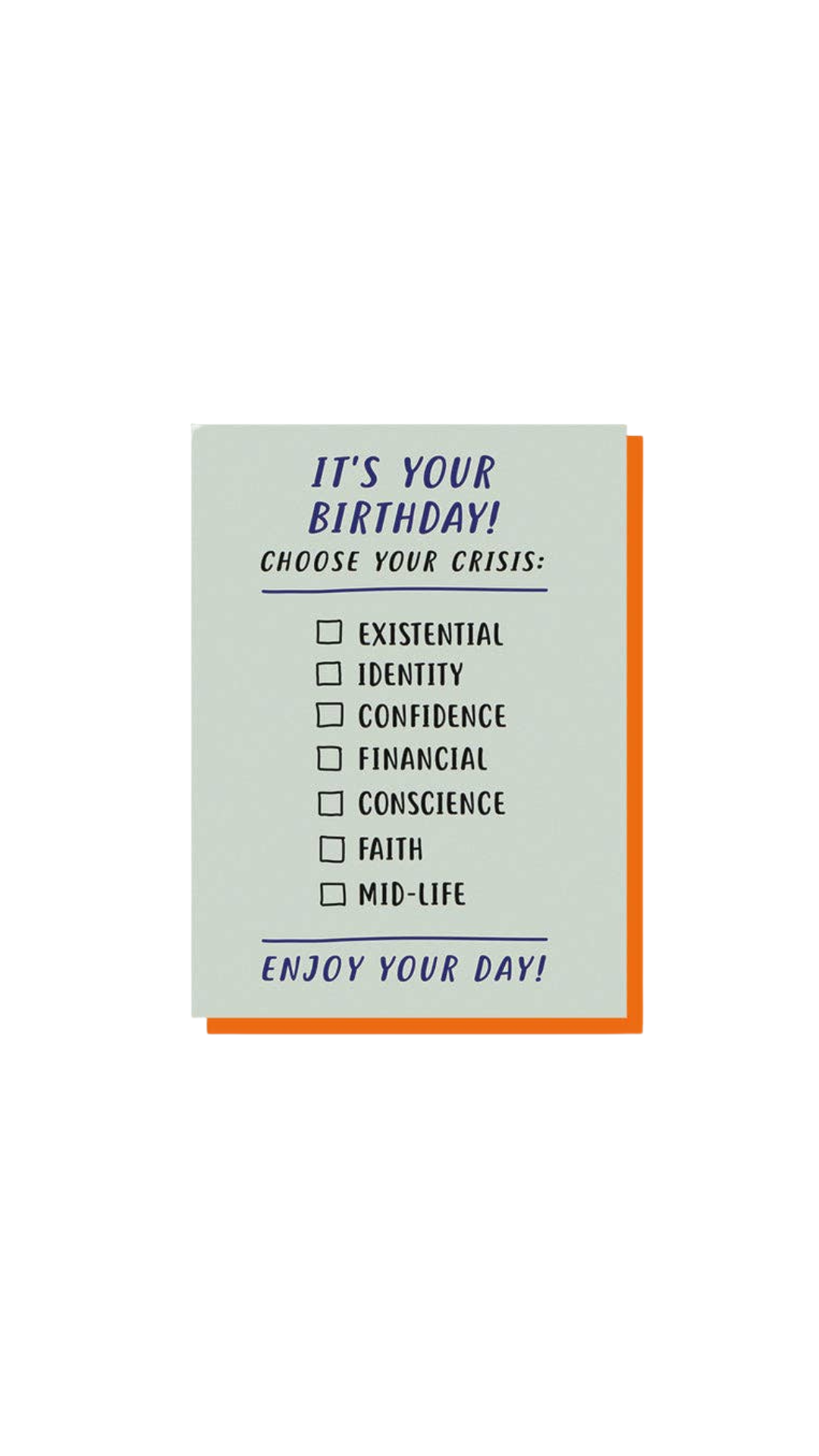 Welche Krise erwartet dich an deinem nächsten Geburtstag? Lustige Geburtstagskarte für alle, die eine existenzielle Krise durchmachen - und diese nicht so ernst nehmen.