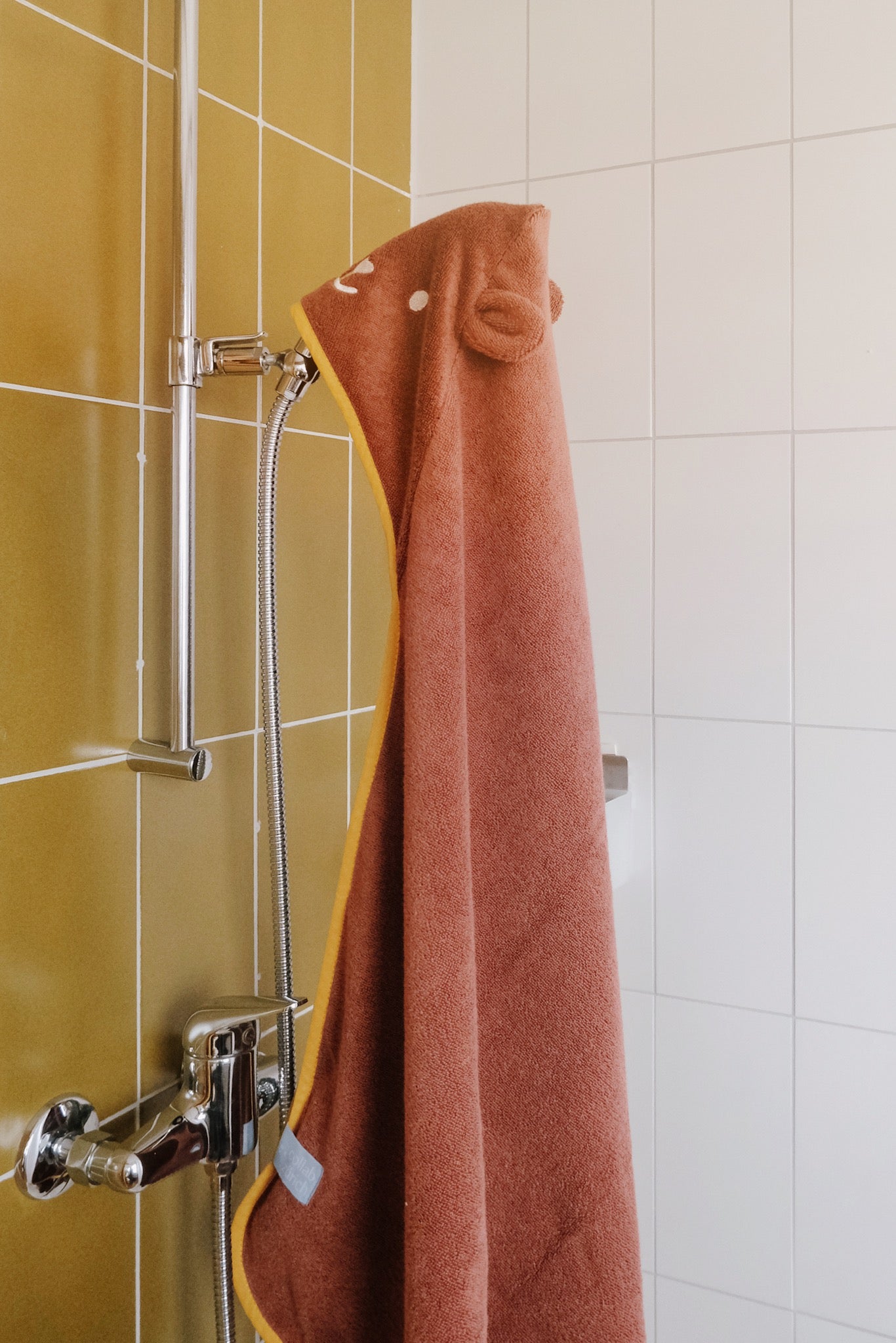 Verleihe dem Baden mit diesem bezaubernden Kapuzen Tuch in Rost mit süssem Bärenmotiv einen gemütlichen Charme. Es ist der perfekte Begleiter für kleine und grosse Badegäste, die sich einen verspielten Farbtupfer wünschen. Weich, kuschelig und einfach nur niedlich – der ideale Begleiter für mehr Badespass. Dies ist eine Zusammenarbeit zwischen uns und Lavie - wir freuen uns sehr!