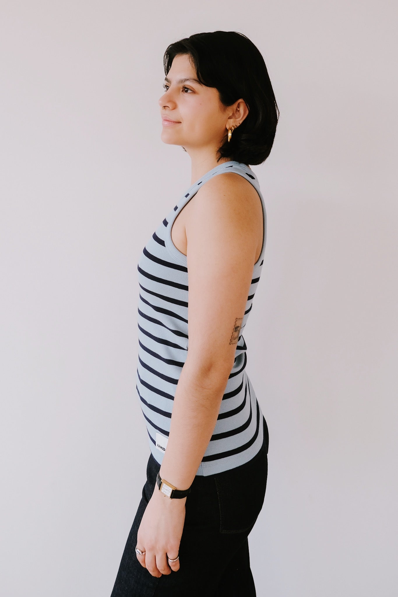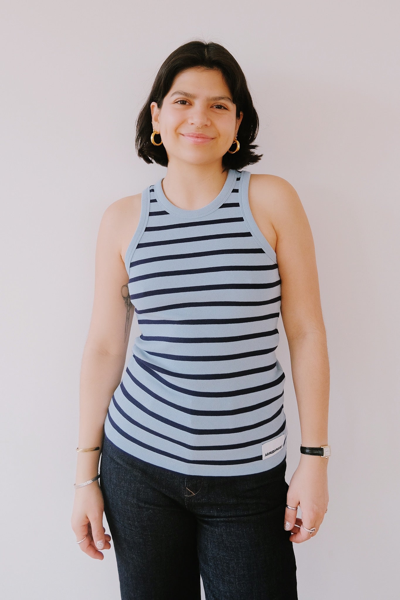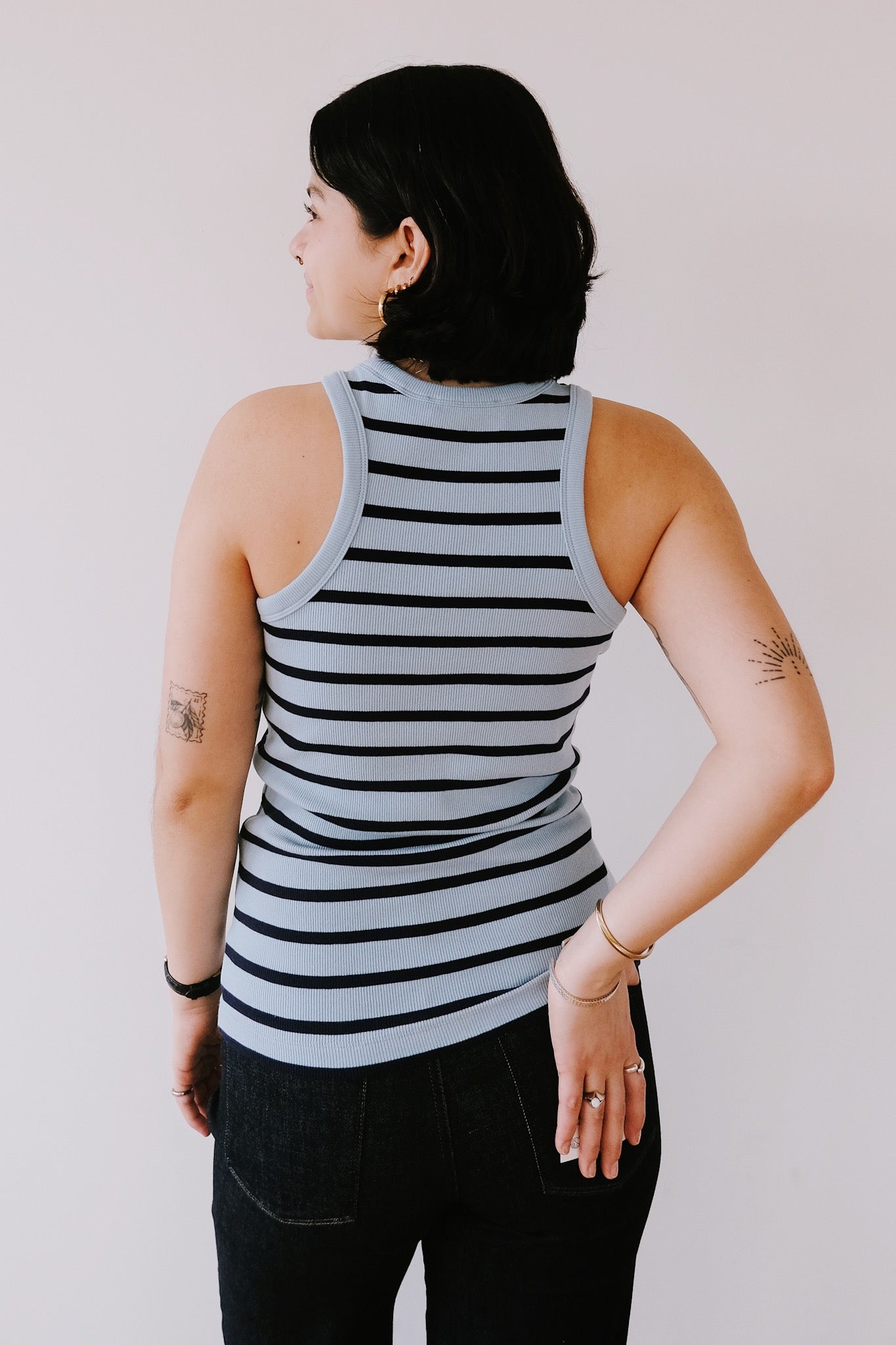 Dieses Tanktop aus Bio-Baumwolle ist das perfekte Basic – jetzt auch in klassischer Marine-Kombination erhältlich! Der taillierte und sportliche Schnitt lässt sich mit Kleidern, Shorts und Hosen kombinieren und ist somit vielseitig für jedes Outfit geeignet.
