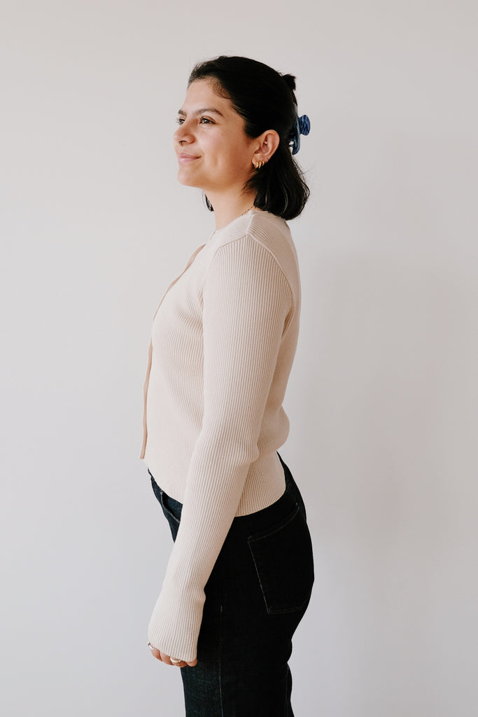 Mache es dir mit diesem Cardigan in Beige gemütlich! Dieser schmal geschnittene Cardigan mit normaler Länge verleiht deinem Alltagslook verspielten Charme. Hergestellt aus 100 % GOTS-zertifizierter Bio-Baumwolle ist er sanft zu deiner Haut und zum Planeten. Dank der Knopfleiste kannst du ihn ganz nach deinen Wünschen stylen – perfekt für einen lässigen Ausflug oder einen gemütlichen Abend zu Hause. Geniesse Komfort und Nachhaltigkeit mit einem Hauch von Verspieltheit!
