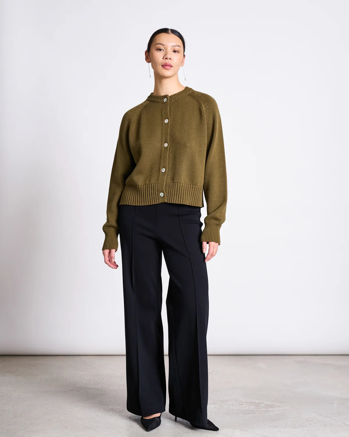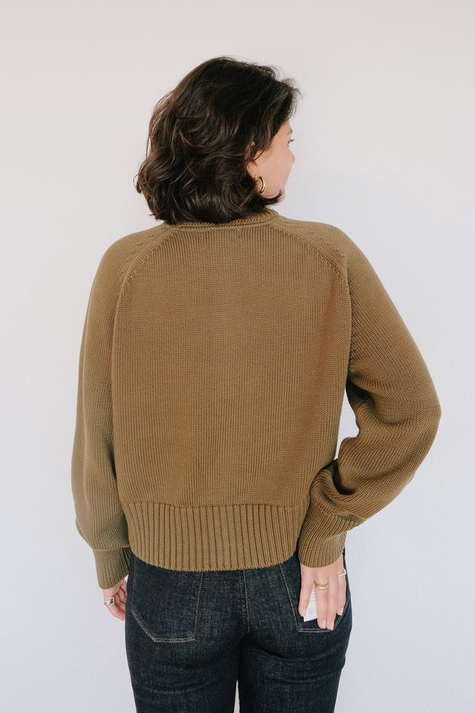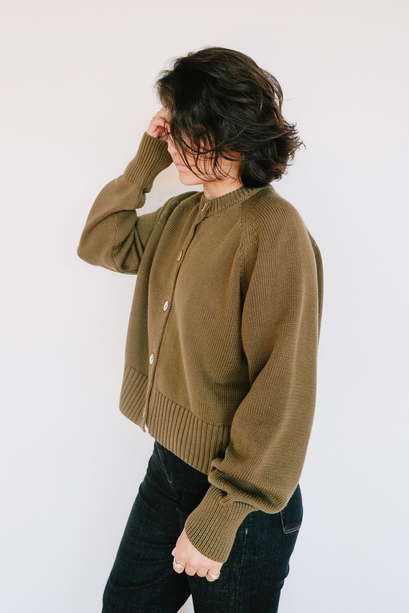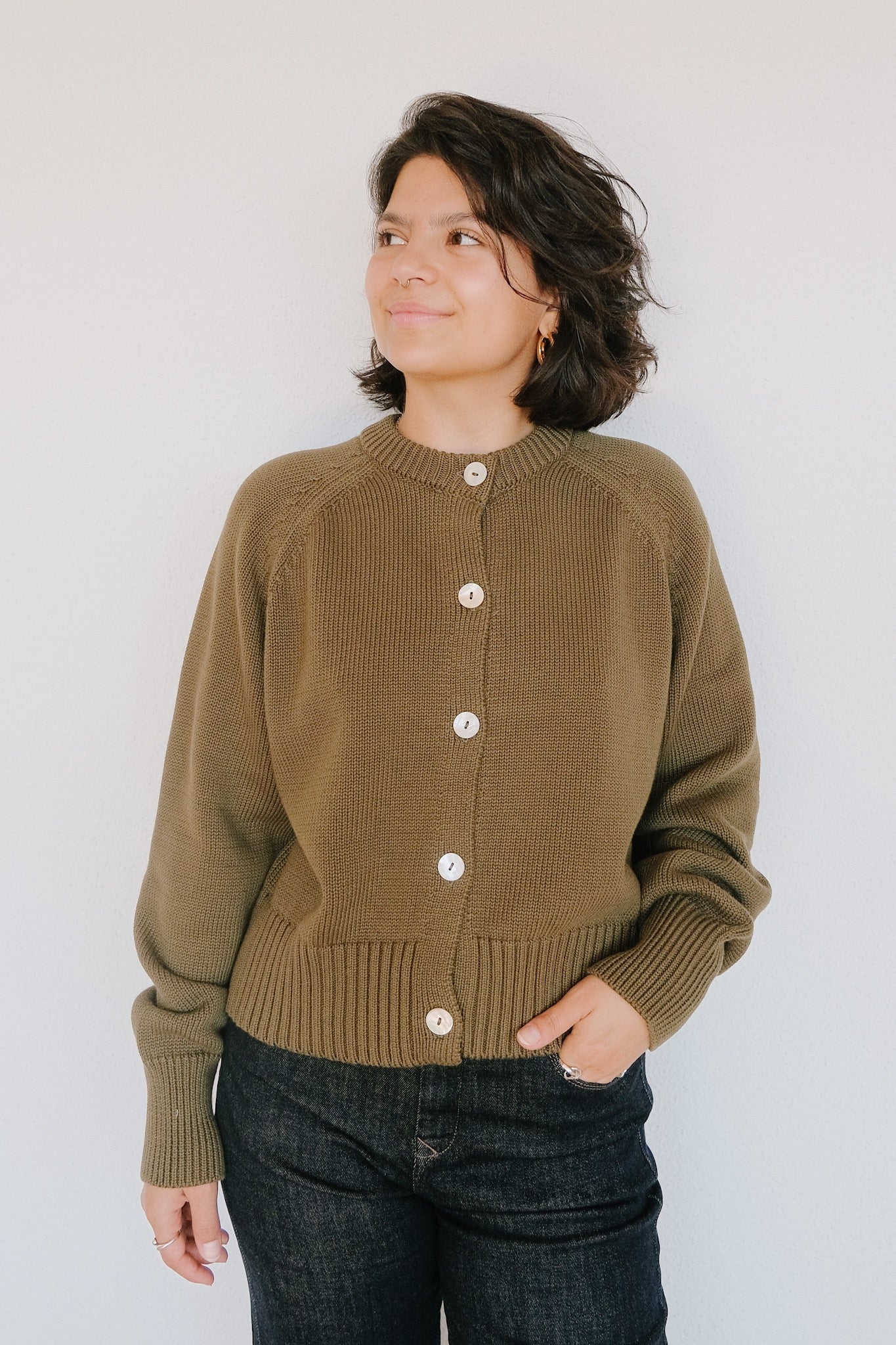 Strickjacke mit Rundhalsausschnitt – Sivia – Woody Olive