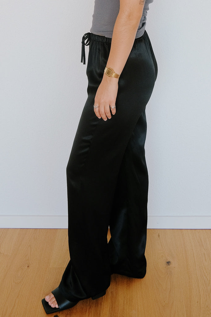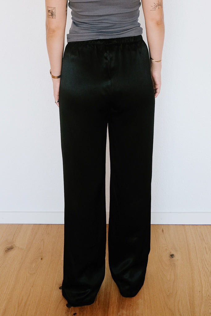 Diese Satinhose Fris in Schwarz kombiniert eine tiefe Taille mit einem flexiblen Kordelzugbund, sodass Du sie ganz nach Belieben tragen kannst – etwas höher für extra Flair oder lässig tief. Hergestellt aus einer seidigen Mischung aus 95 % ENKA® Viskose und 5 % Circulose®, fällt sie weich und glänzt wie Seide, ist aber komplett vegan. Perfekt für die durchtanzte Nacht auf einer Hochzeit oder um jedem Anlass einen Hauch von müheloser Eleganz zu verleihen!