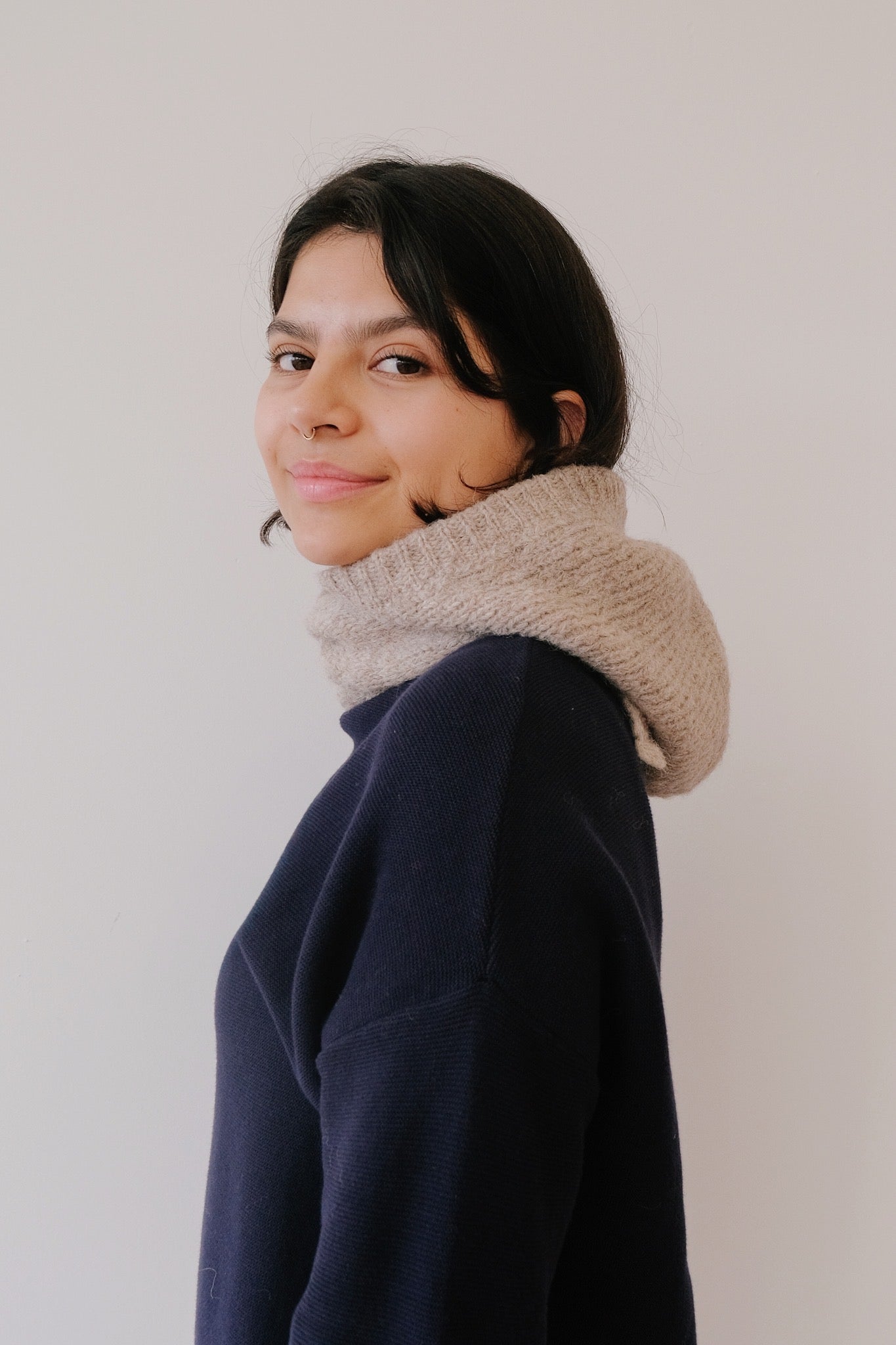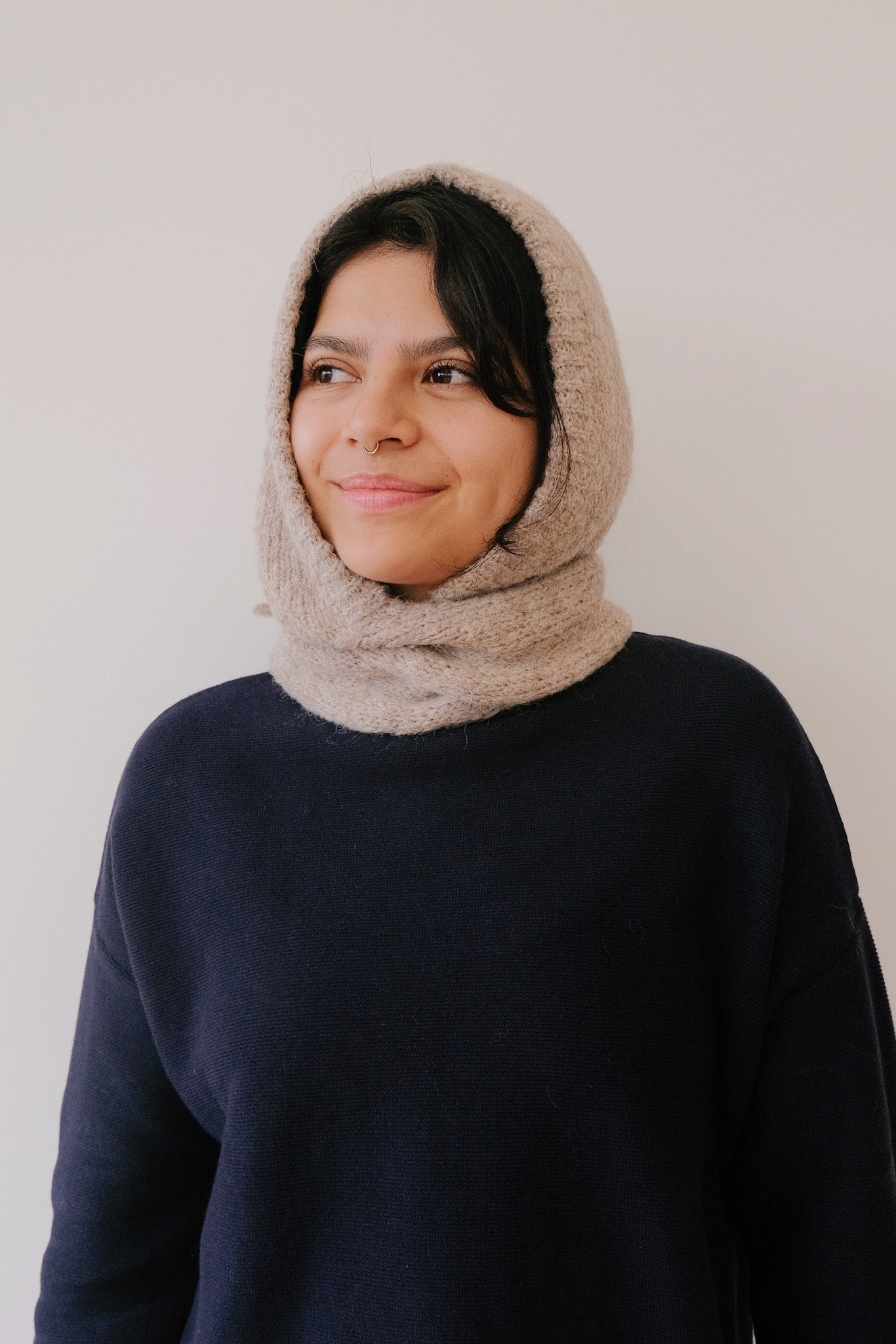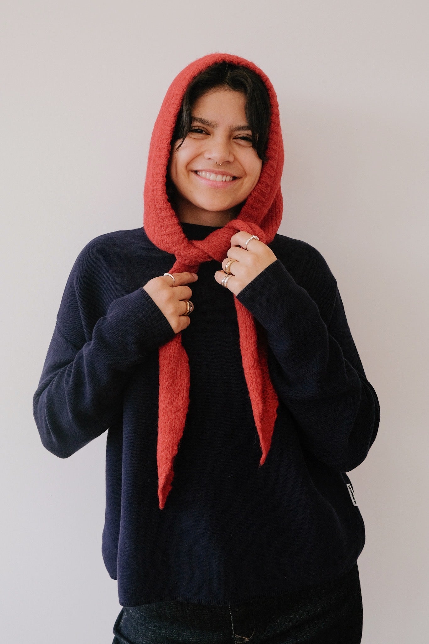 Wrap yourself in cozy luxury with this scarf, crafted from the finest alpaca wool. Its relaxed fit and clever design combine a hood and scarf, adapting effortlessly to any head shape or hairstyle. Perfect for chilly days when you want both warmth and style with a playful twist.
