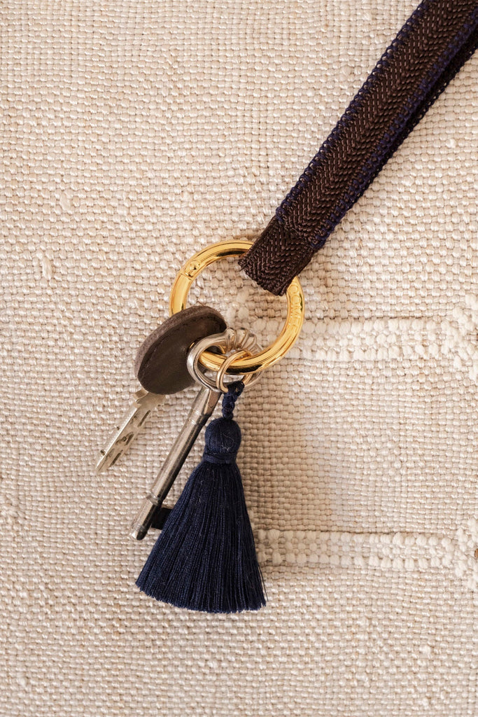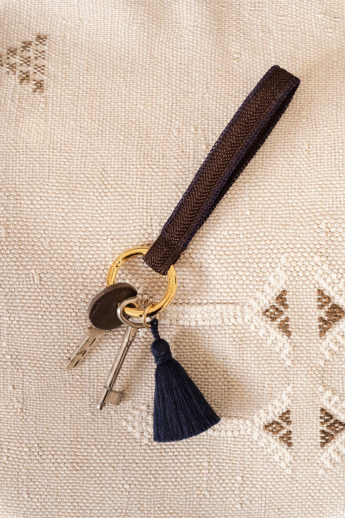 this keychain is made from a moroccan ribbon called sfifa, which is traditionally used to decorate elegant kaftans. the process begins with sabra threads, which are braided into sfifa on the outskirts of marrakech, using an antique machine. step by step, the threads are transformed into this unique keychain.