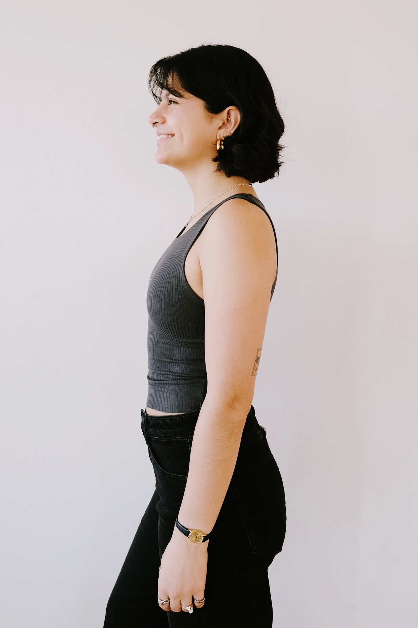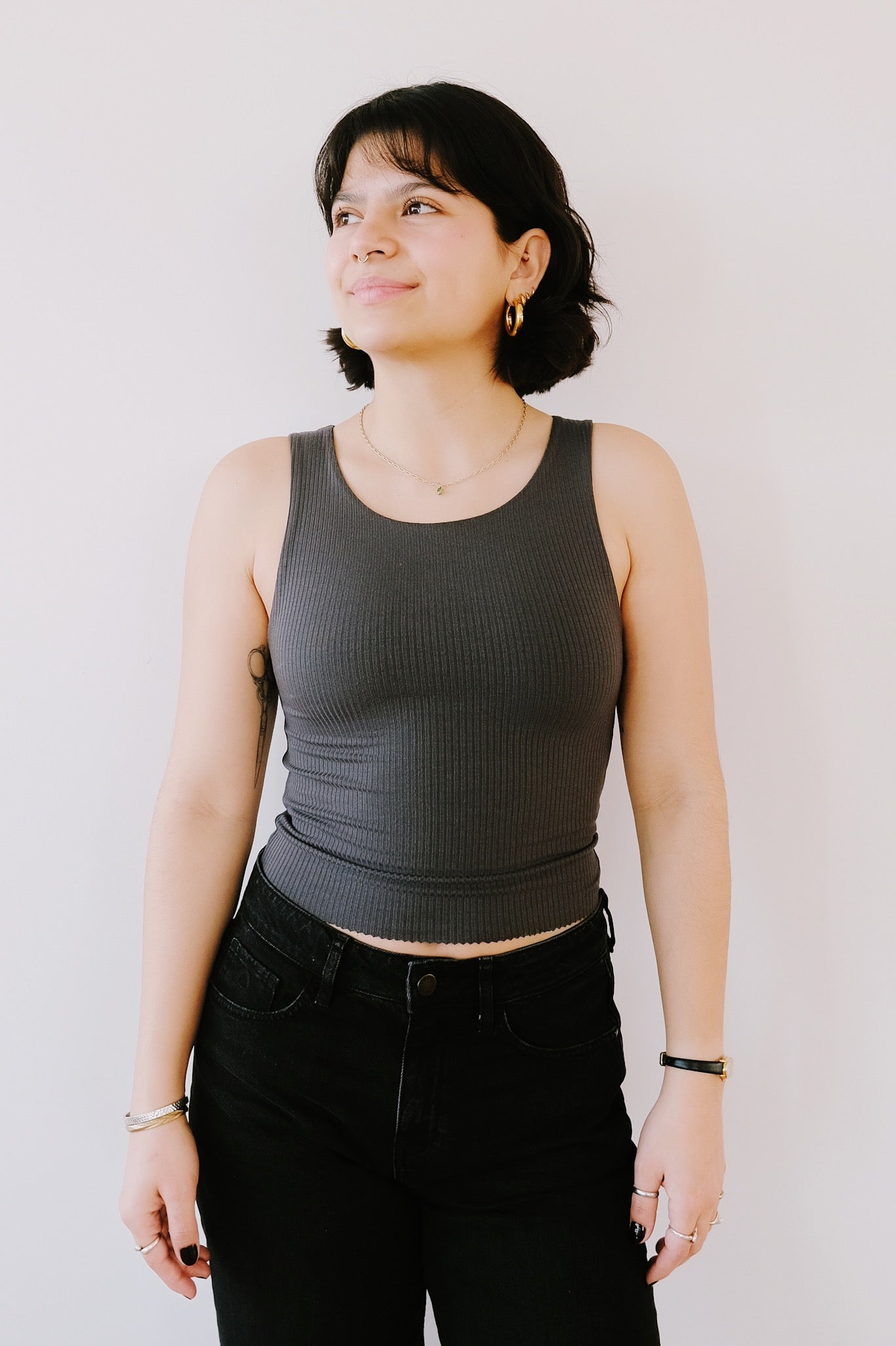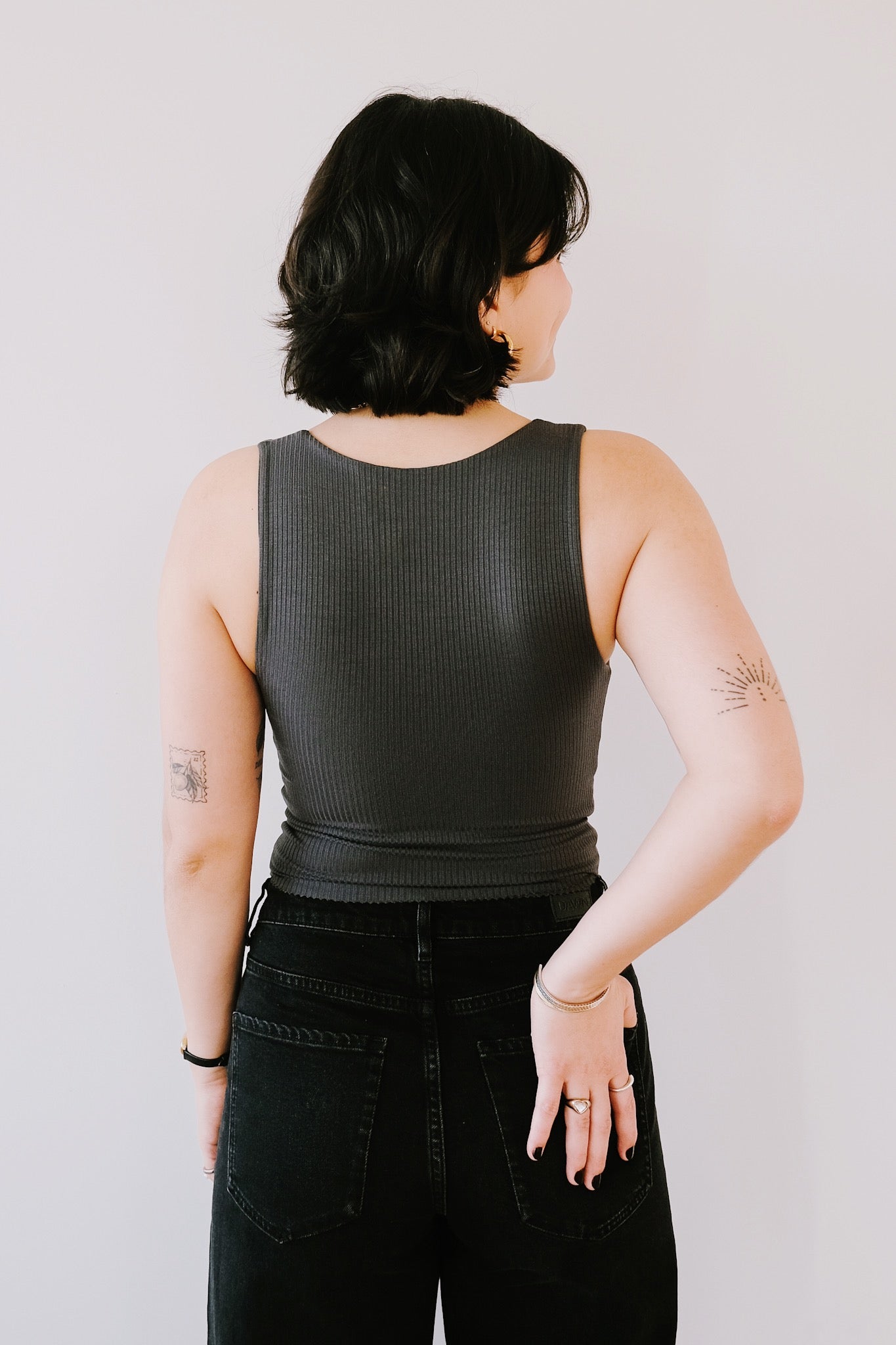 Dies ist das Must-Have-Crop-Top. Es hat einen hohen Rundhalsausschnitt. Der gerippte Stoff ist superweich und sehr elastisch. Egal ob kleine oder größere Oberweite, dieses Top passt sich sehr gut an. Nach mehrmaligem Waschen franst der Zick-Zack-Saum etwas aus, was den Look noch cooler macht.