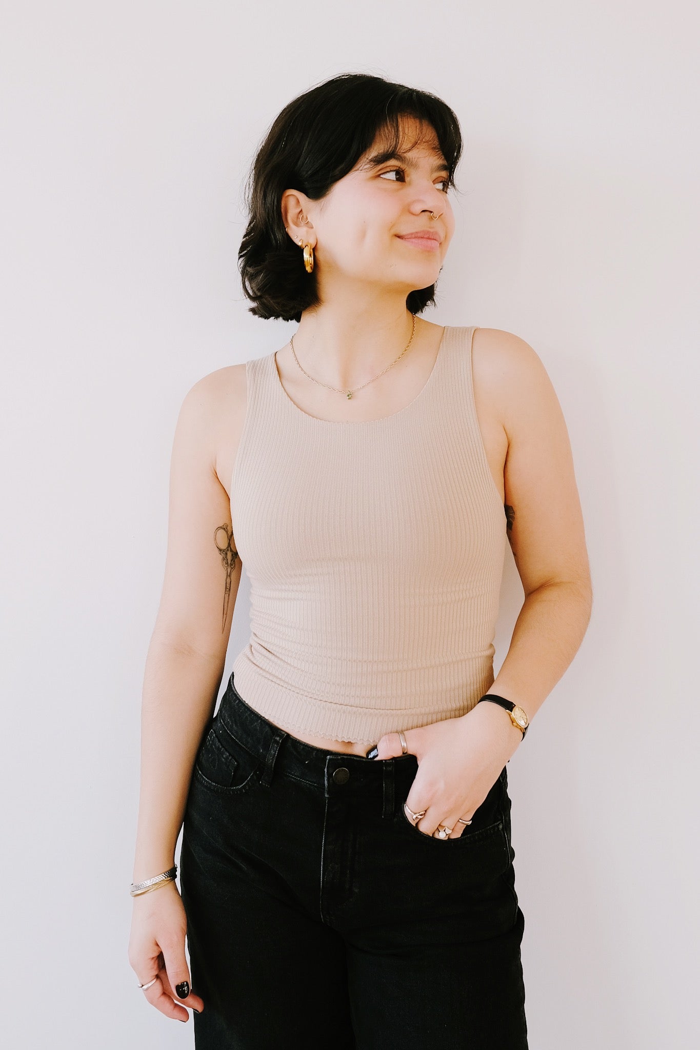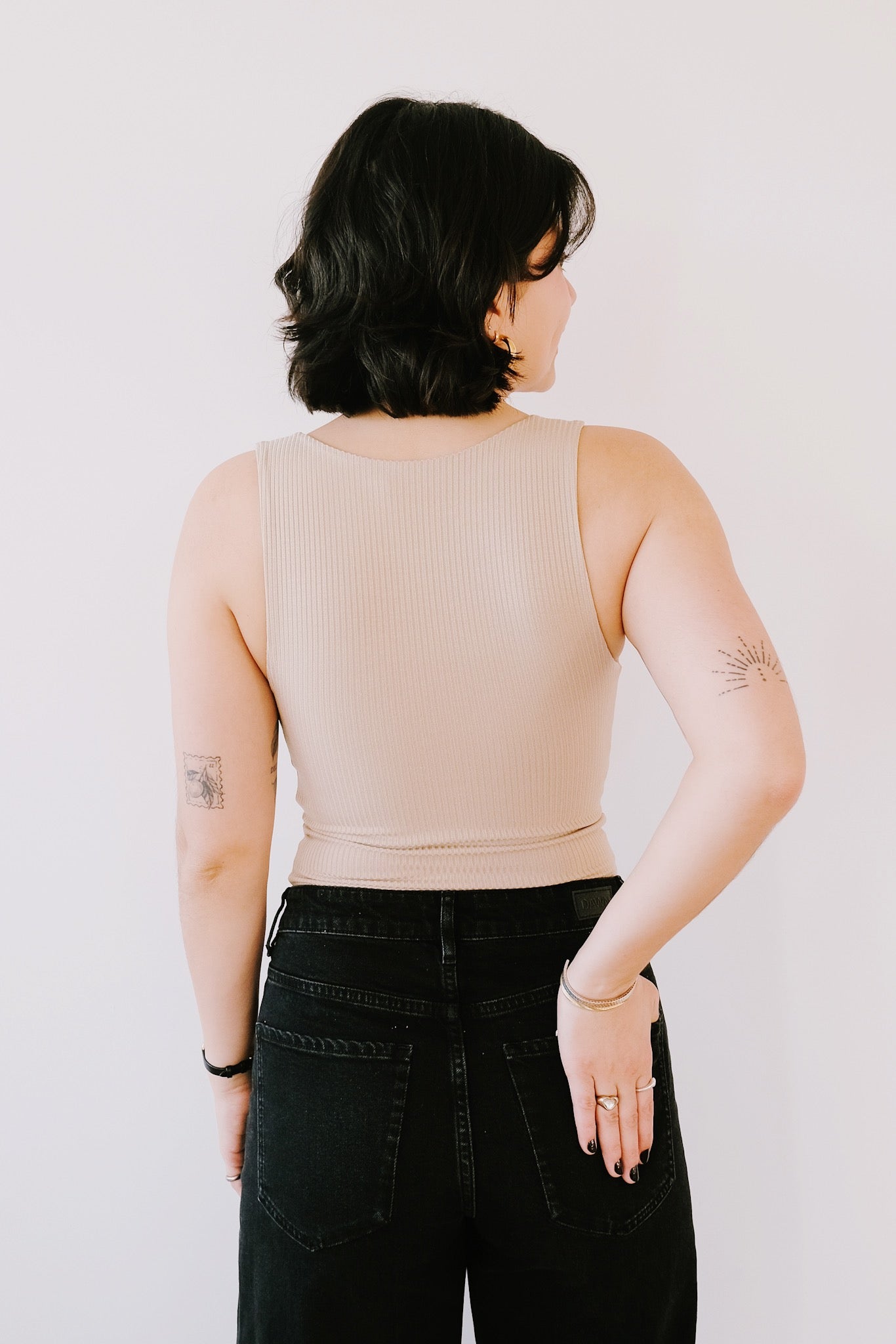 Das ist das Must-Have-Crop-Top. Es hat einen hohen Rundhalsausschnitt. Der gerippte Stoff ist superweich und sehr elastisch. Bei kleiner oder größerer Brust passt sich dieses Oberteil sehr gut an. Nach mehrmaligem Waschen franst der Zick-Zack-Saum etwas aus, was den Look noch cooler macht.