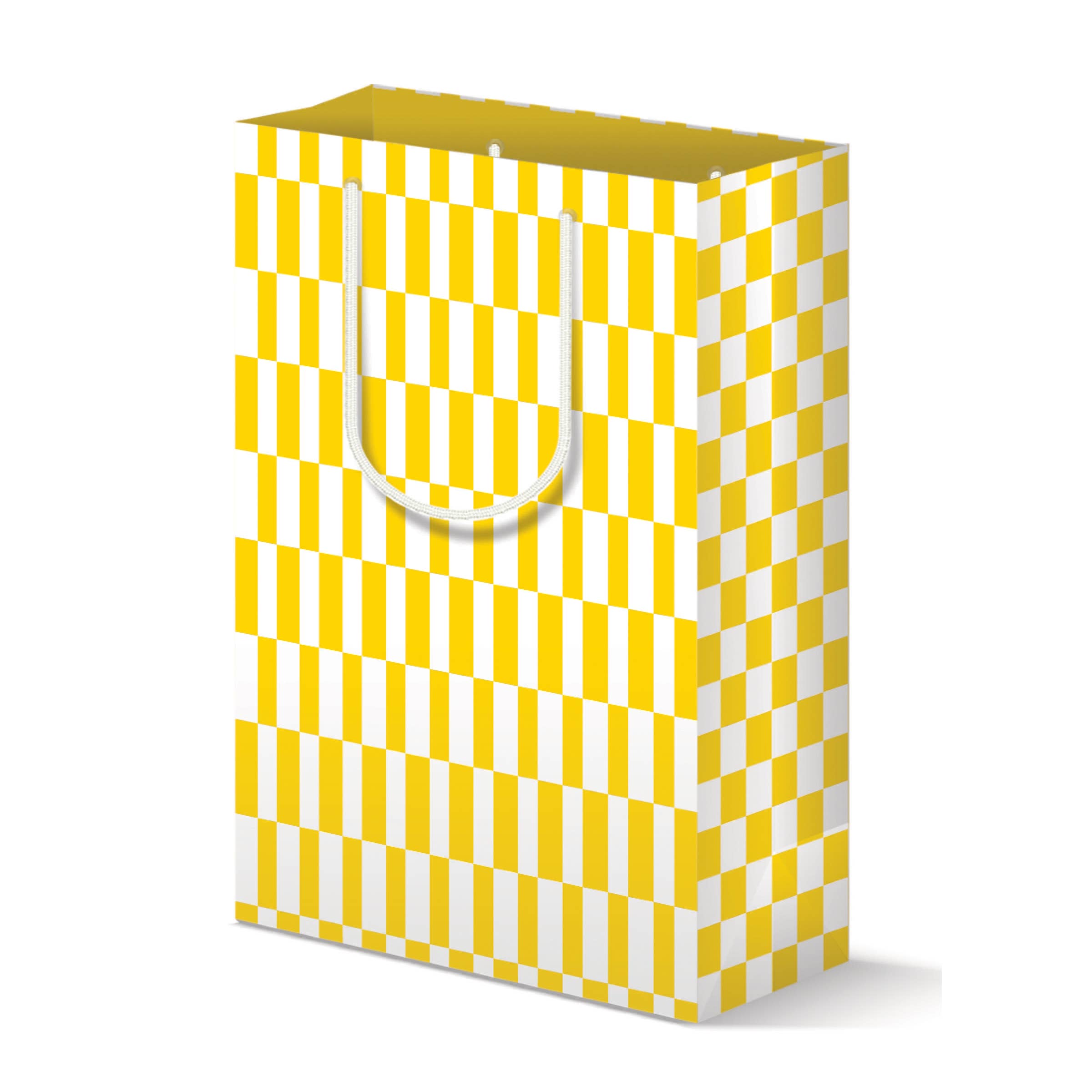 Mit dieser verspielten Geschenktüte im gelben Schachbrettmuster machen Sie Ihre Geschenke noch lustiger. Die Tasche mit unterbrochenen gelben und weißen Streifen und einer kontrastierenden gelben Schachbrettseite ist in leuchtenden Farben auf luxuriösem, schwerem Karton gedruckt. Robust und geräumig, eignet sie sich perfekt, um selbst Ihre schwersten Geschenke stilvoll zu transportieren.