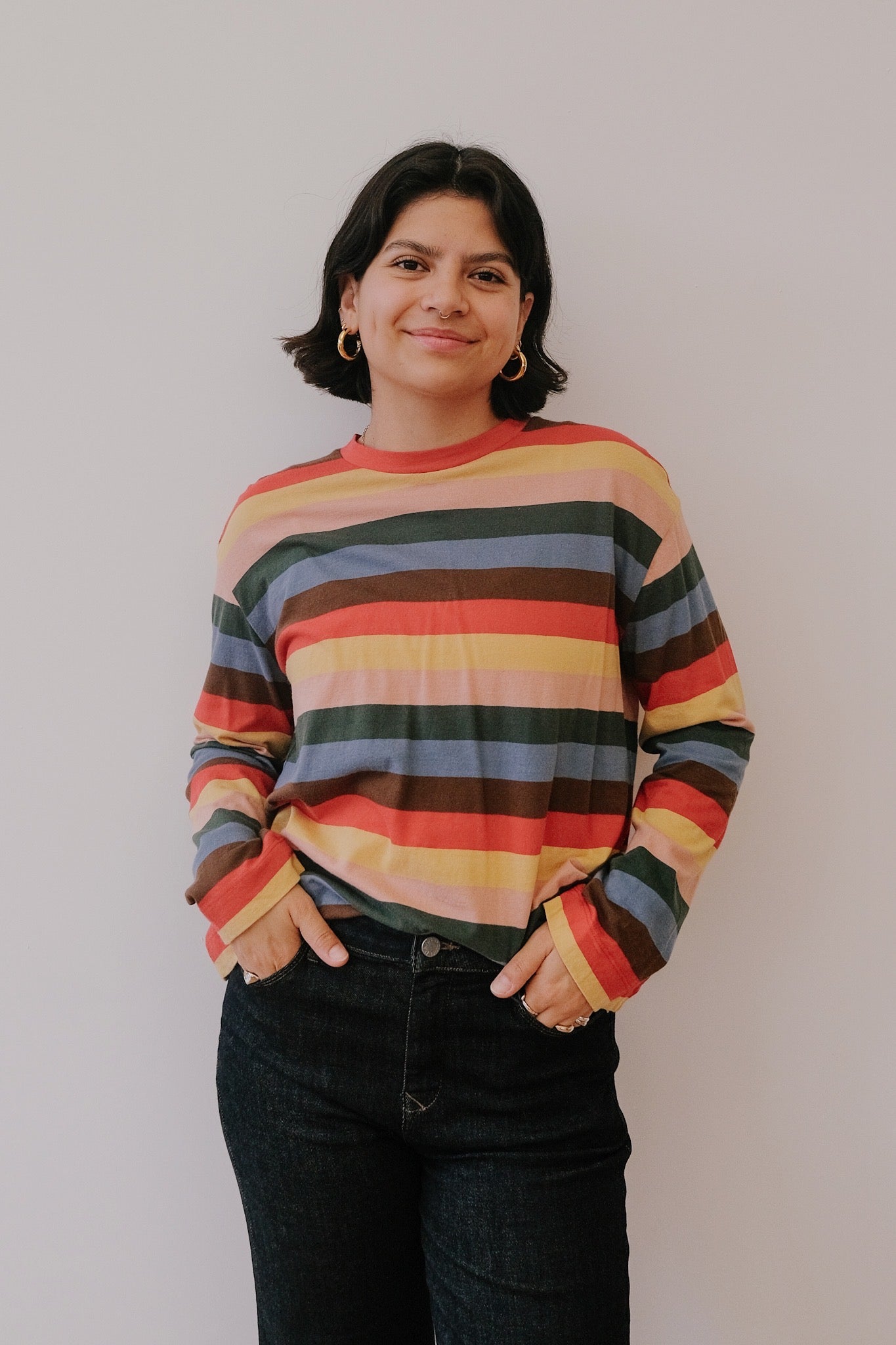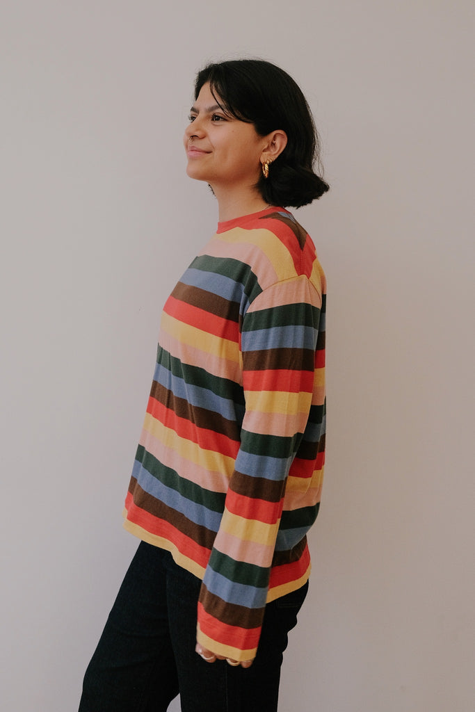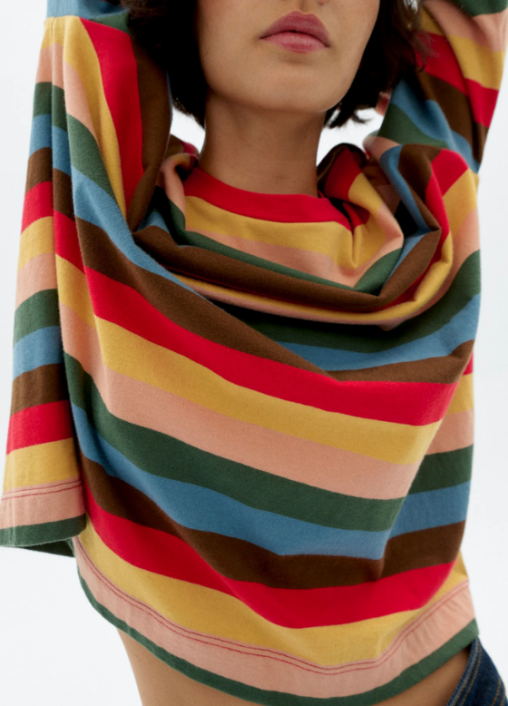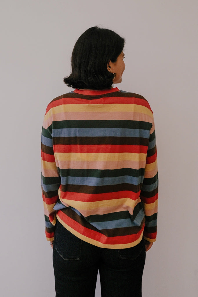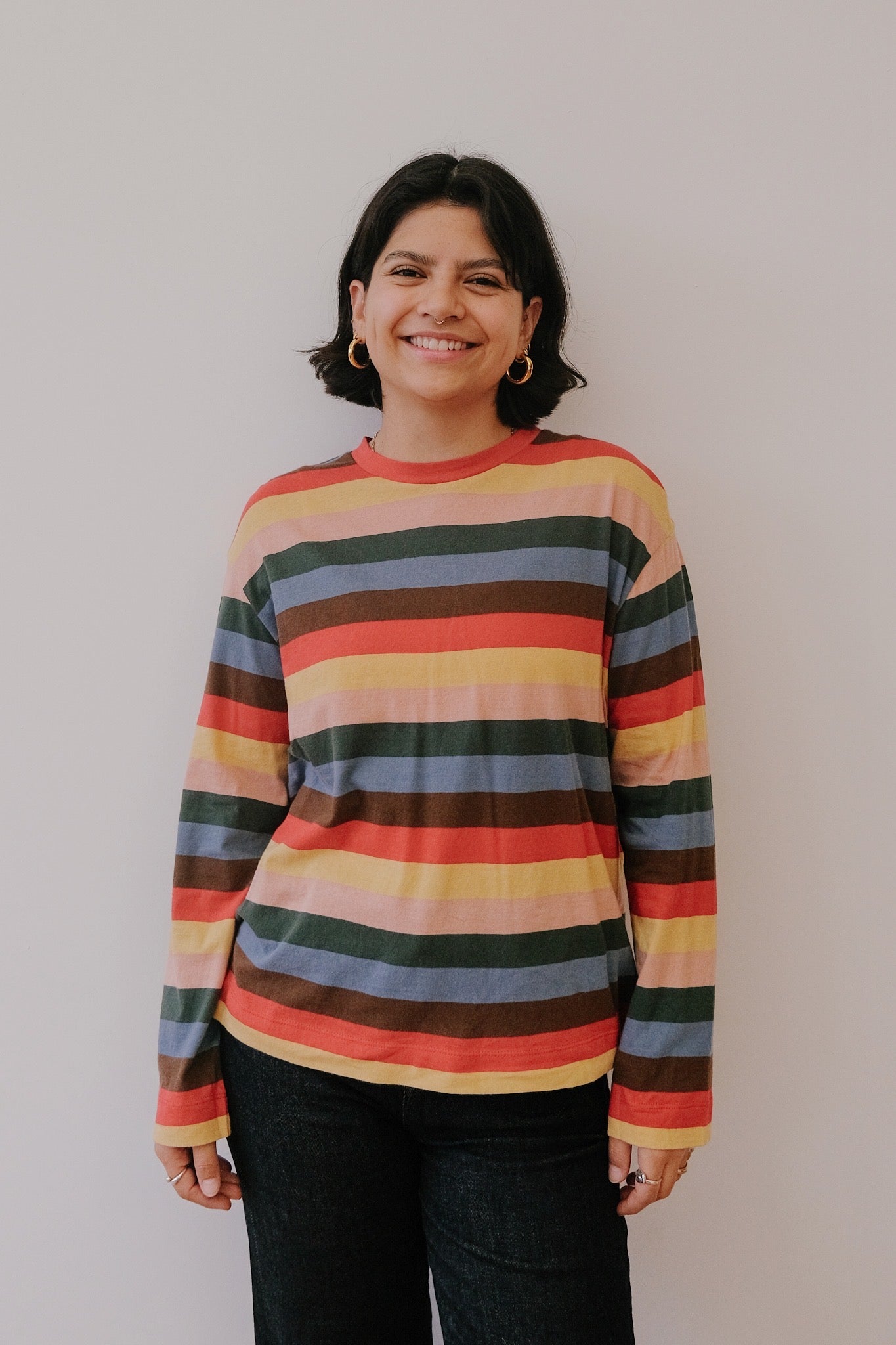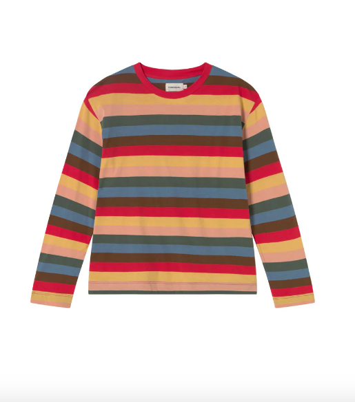 This oversized longsleeve with sunset stripes combines classic style with a fun, playful flair. Crafted from soft, durable organic cotton, it brings a sustainable touch to your wardrobe. Perfect for adding a fresh, modern twist to timeless nautical vibes in any outfit.