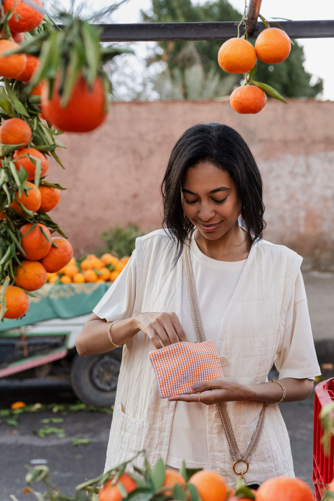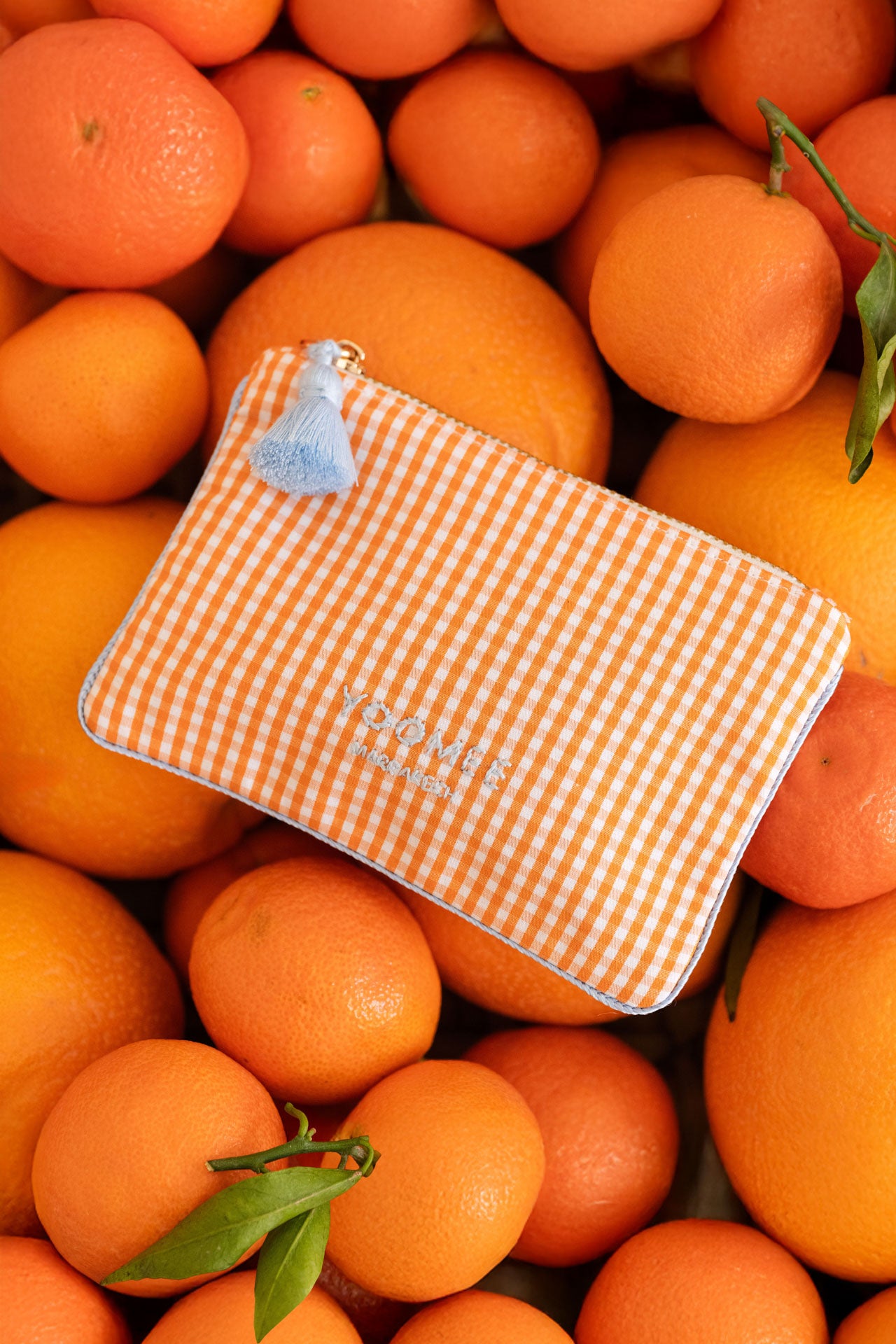 Dieses farbenfrohe Portemonnaie hat die perfekte Größe für einige Karten und Münzen oder kleine Dinge, die Sie gerne bei sich tragen. Es verfügt über einzigartige Baumwollstoffe, ein handgesticktes Logo und einen aufwendigen Rand entlang des Reißverschlusses. Außerdem hat es eine süße kleine Quaste am Reißverschluss.