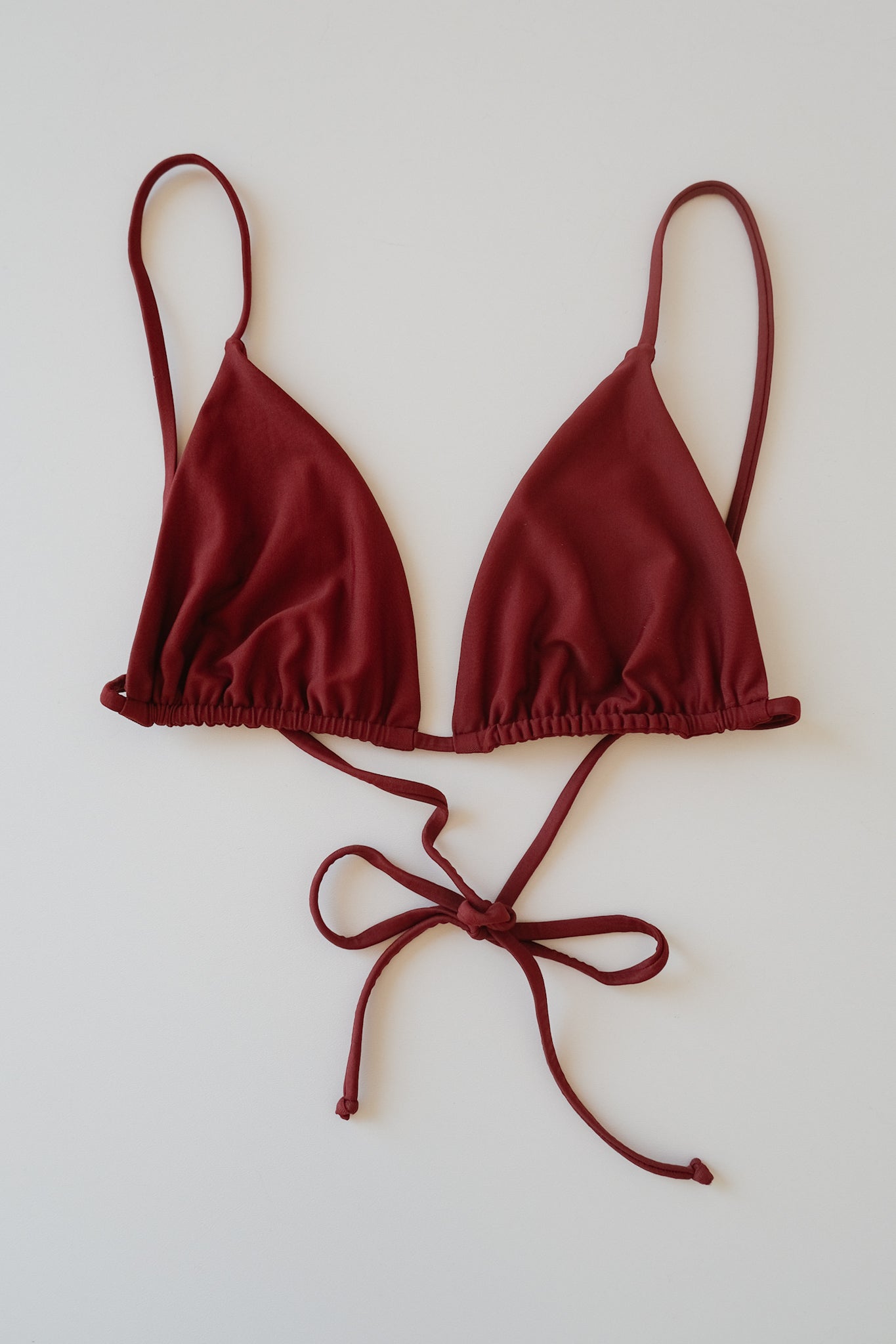 add a playful touch to your beach look with the tri bikini tops! featuring a classic triangle style in a dark red color, this top offers minimal tan lines and adjustable coverage by scrunching the cups. the double-lined cups provide perfect coverage while the thin straps are perfect for tanning and chilling out.