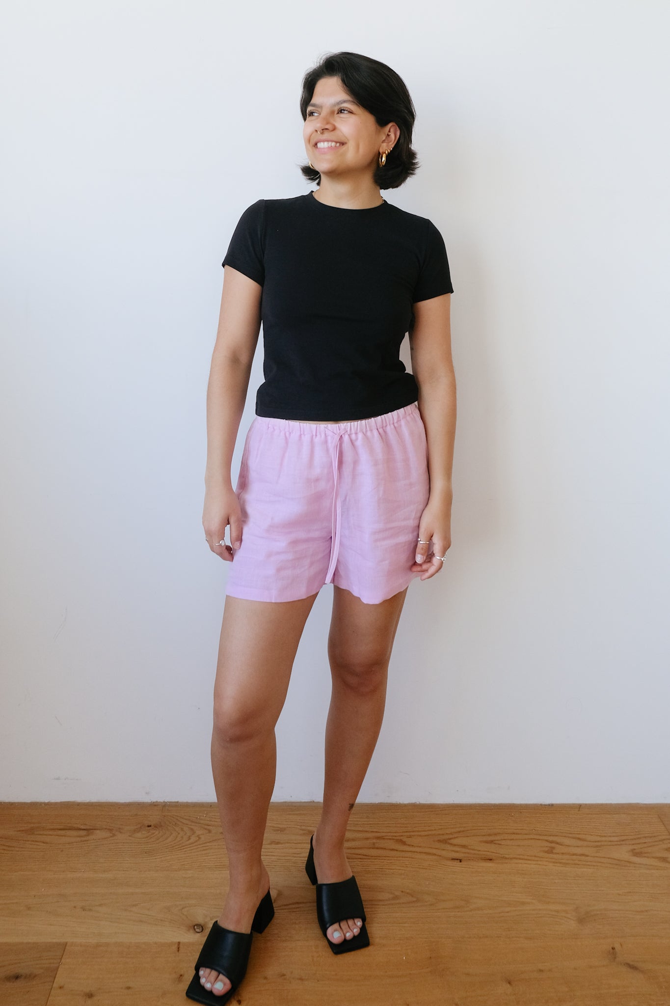 stay cool in these linen shorts! made from 100% european linen, these wide shorts feature a mid waist, elastic waistband, and maximum breathability. perfect for lounging or on-the-go, you'll love the firm grip and comfort of these light orchid drawstring shorts.