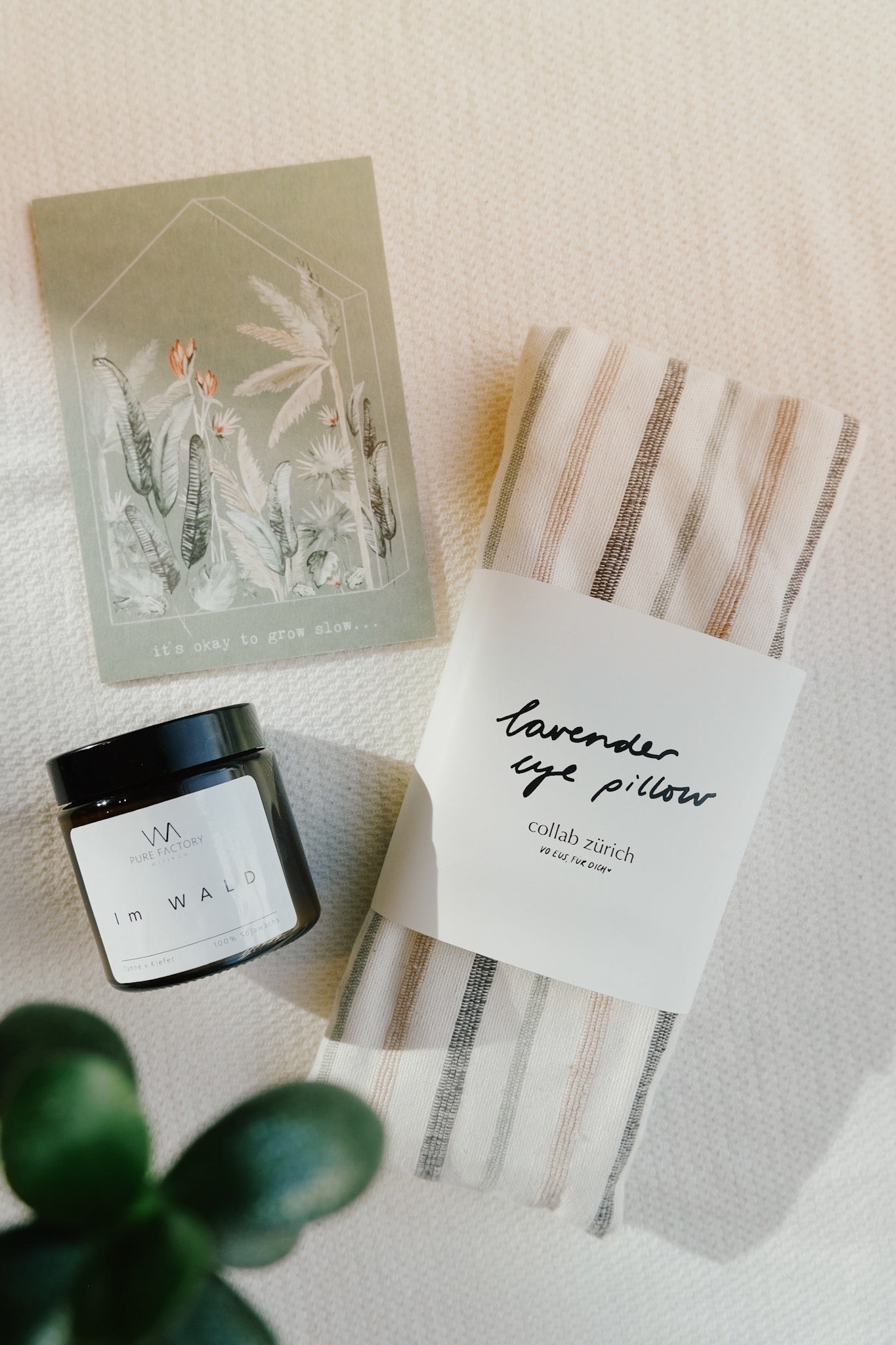 This gift set is for winding down. The eye pillow is perfect for after meditating or yoga and can be warmed or cooled. The scented candle will spread cozy vibes in your home. A cute card goes with this set for your personal love note.