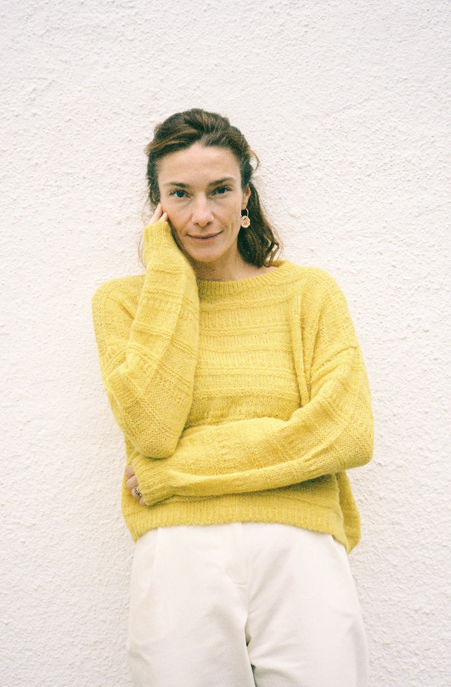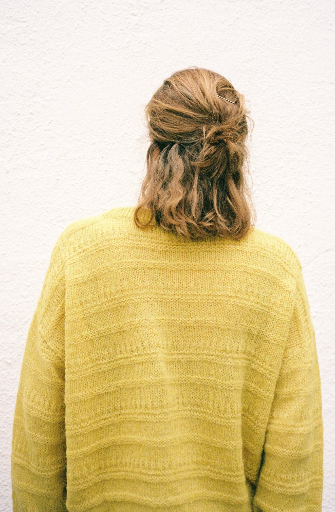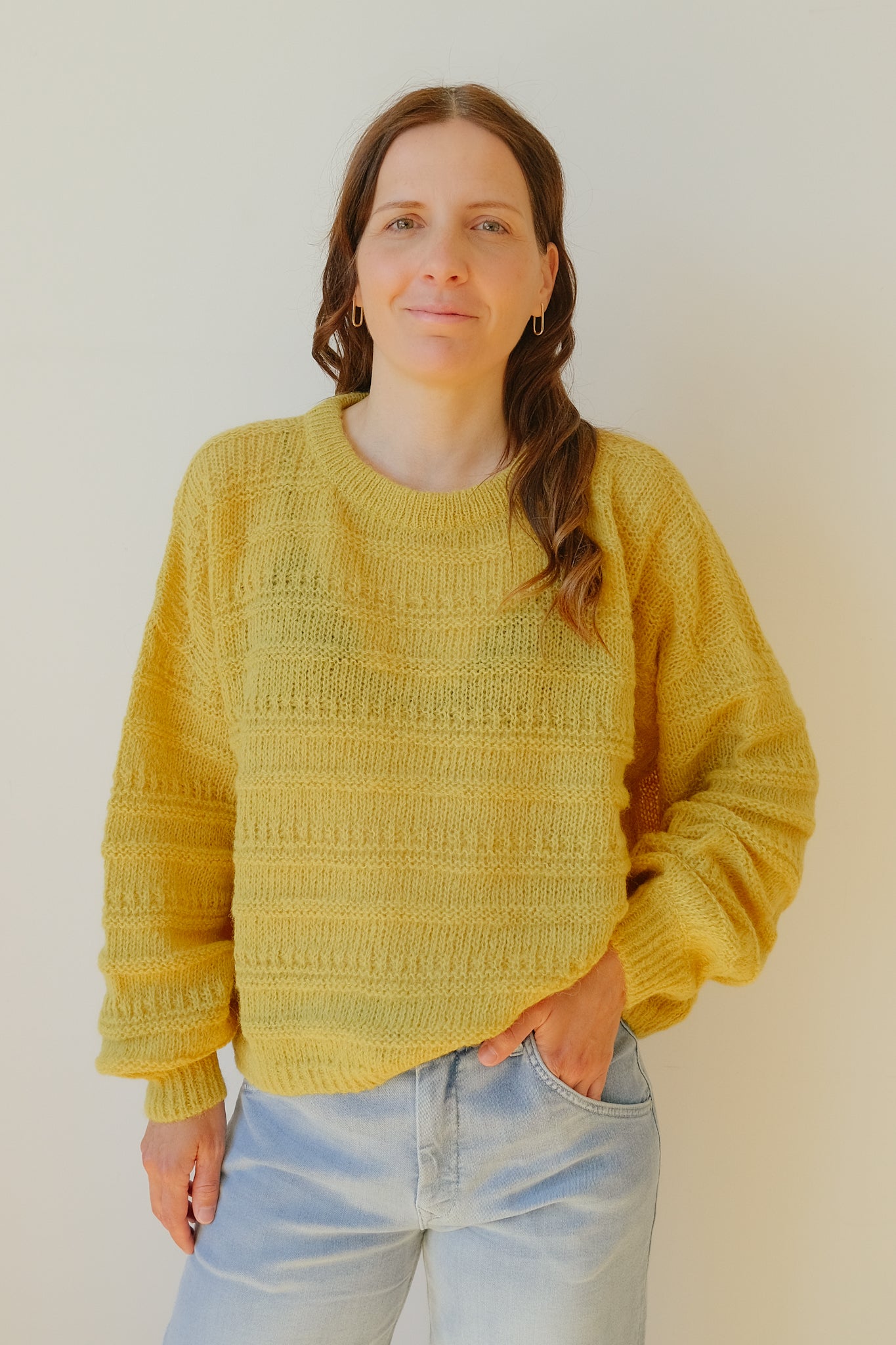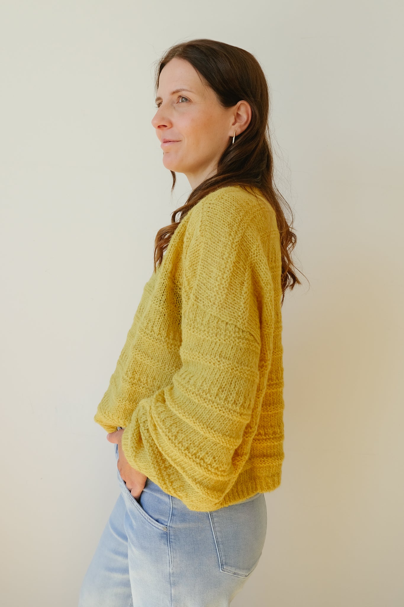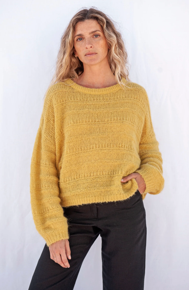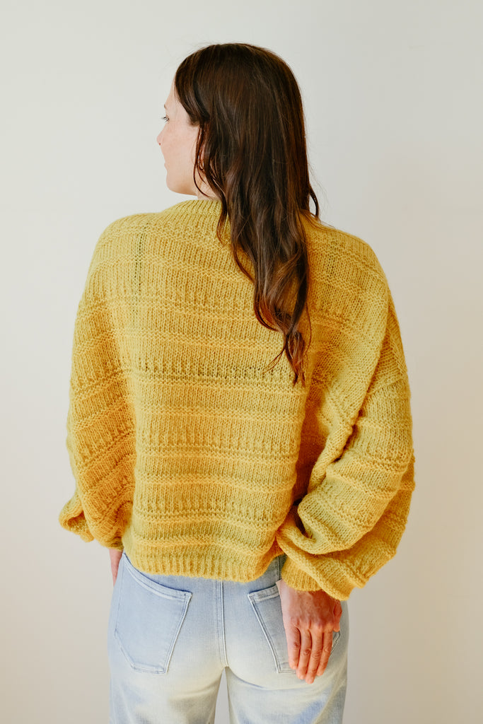 juliet, the world's fluffiest sweater, ever! quadratically shaped, featuring a round neck and embellished with horizontal cable knit details. choose between simple white or this fun bright mustard yellow!