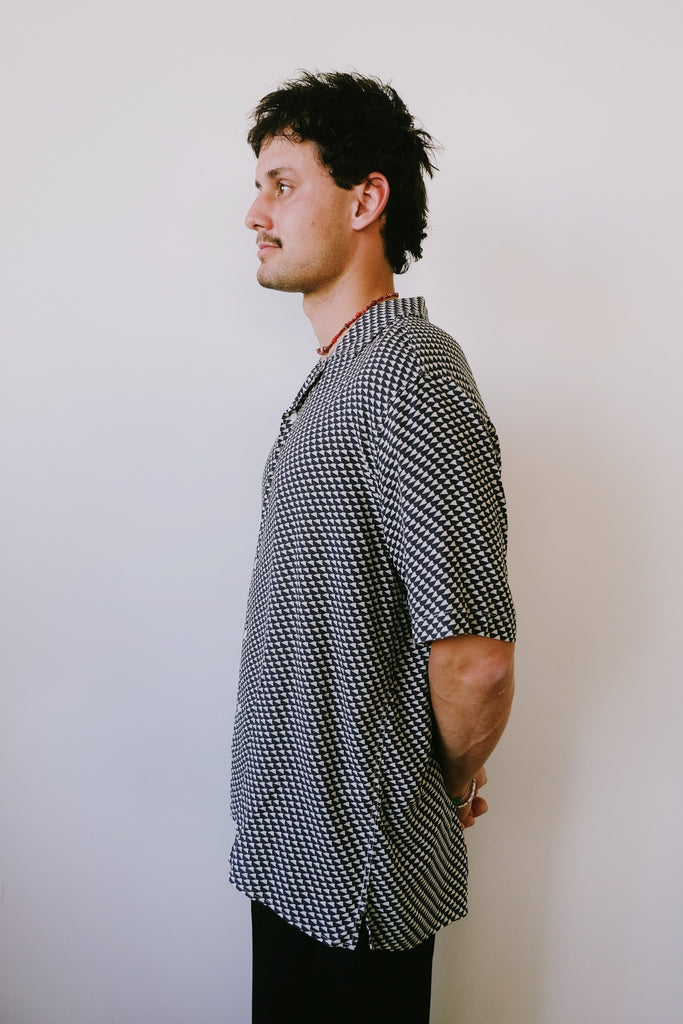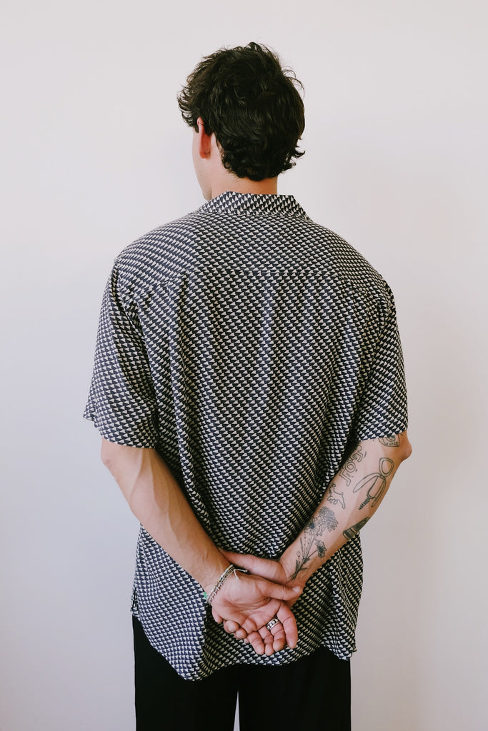 this fun print coupled with the super soft and flowy material makes this shirt perfect for the summer. express your playful side with this tramunta shirt in navy.