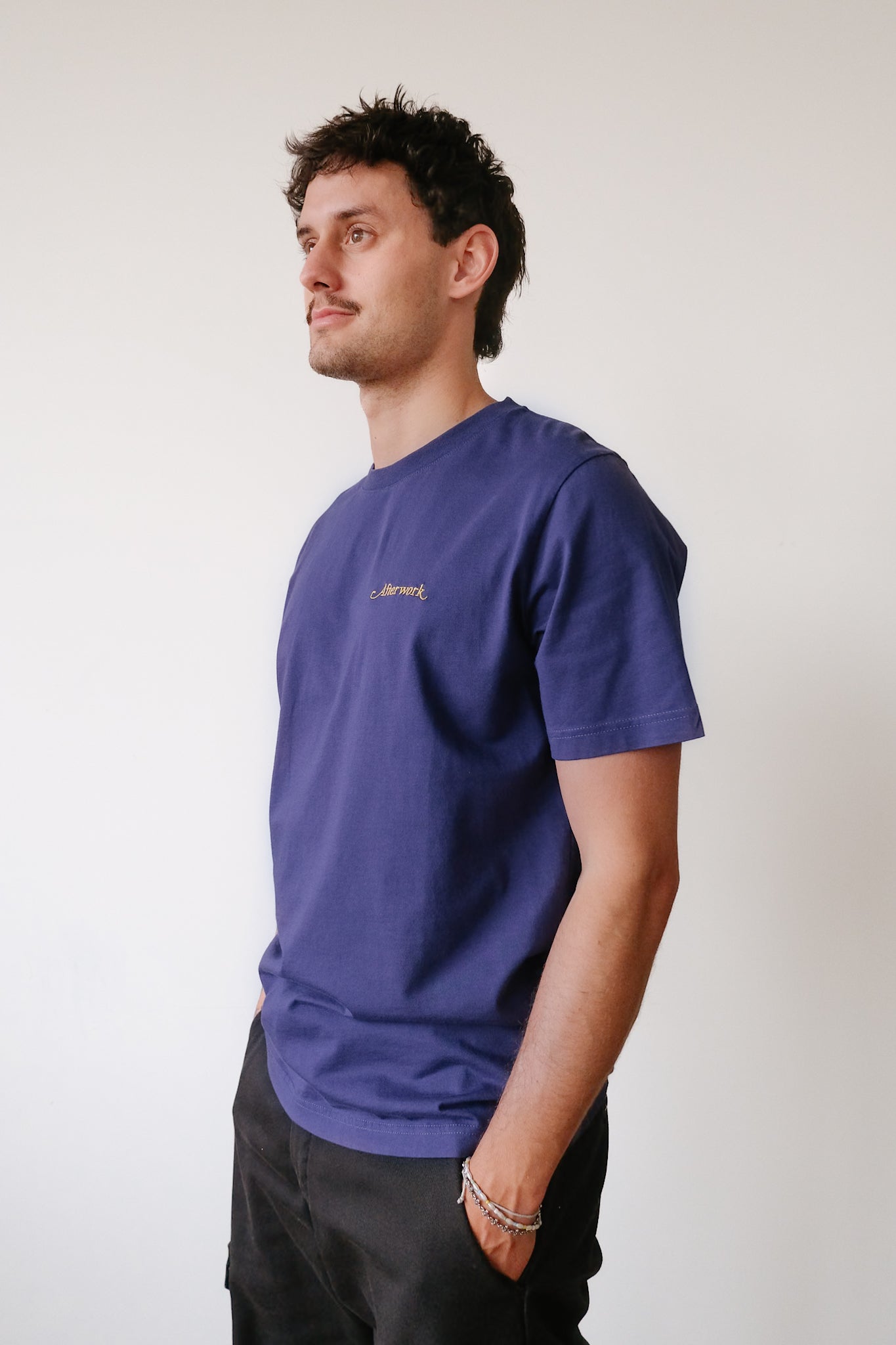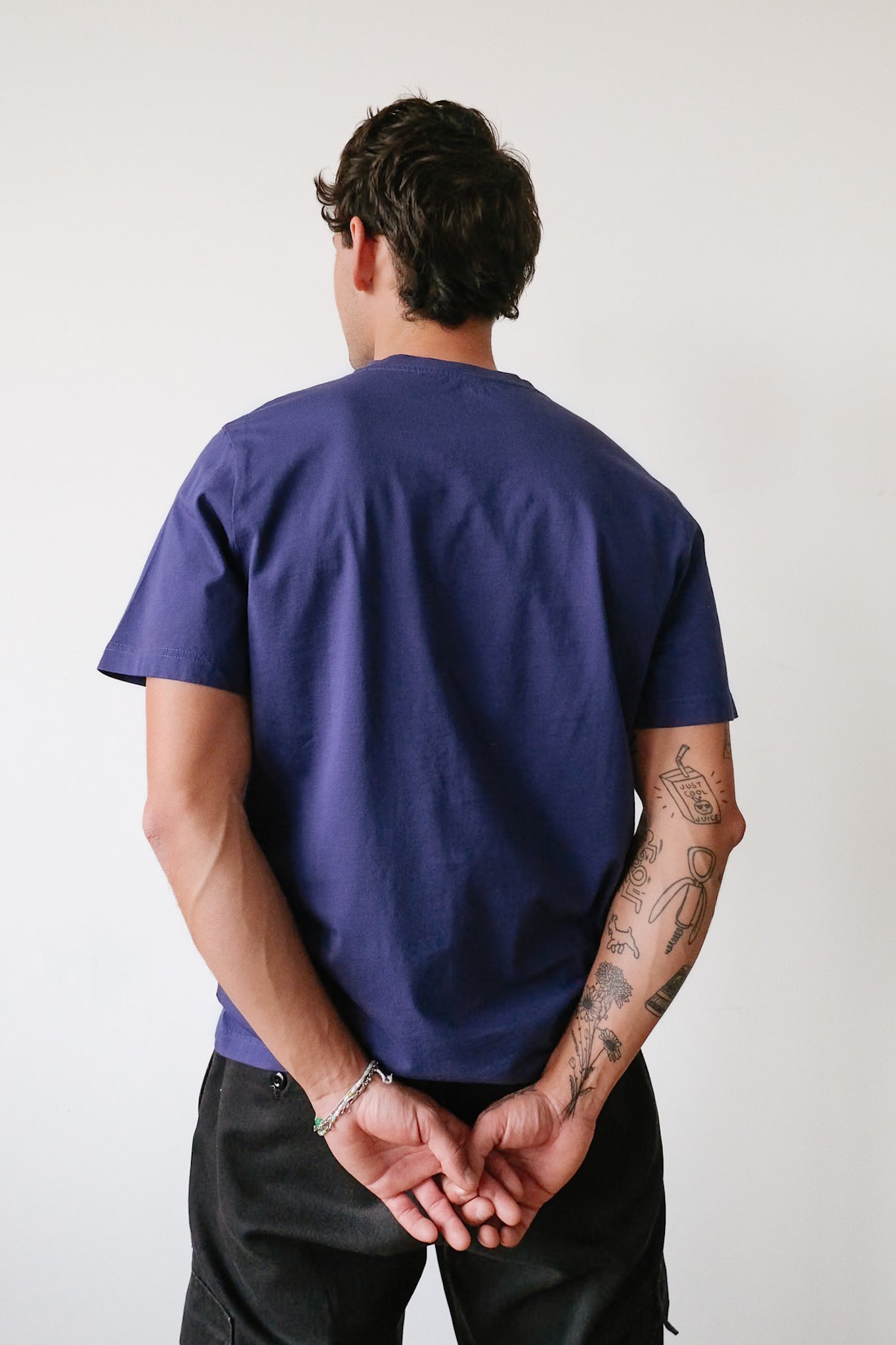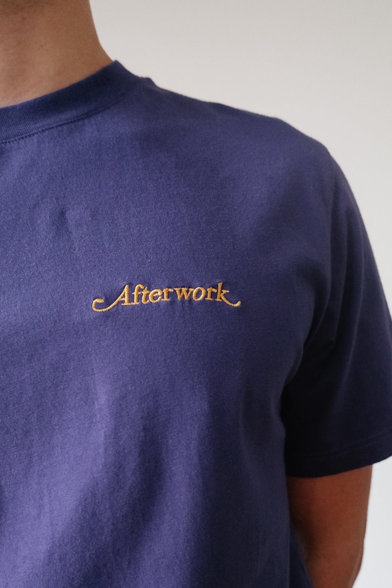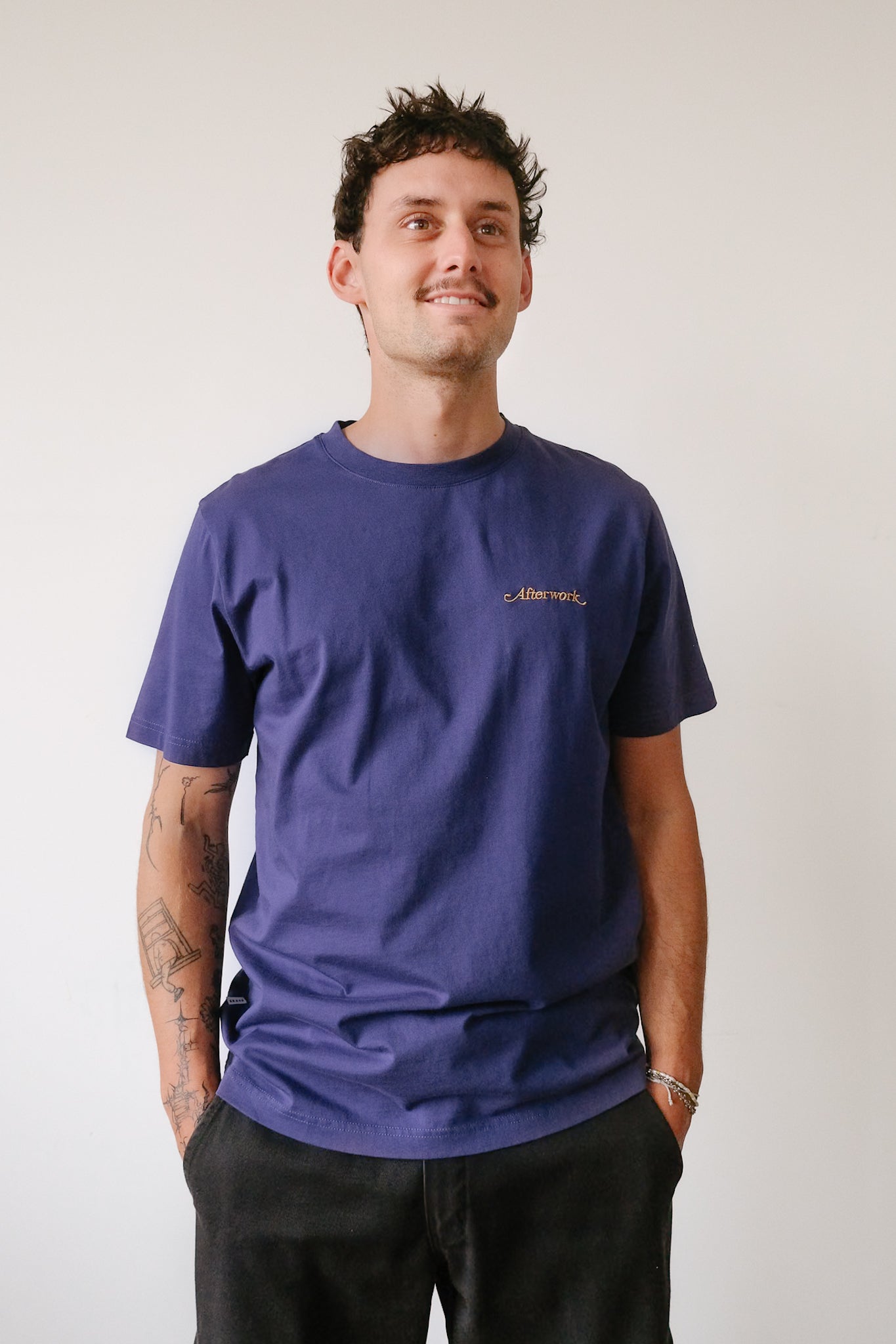 make a statement with this organic cotton navy t-shirt, perfect for after hours. the afterwork stitching adds a touch of quirkiness to this classic piece. upgrade your casual look and feel good about your impact on the environment with this sustainable option.