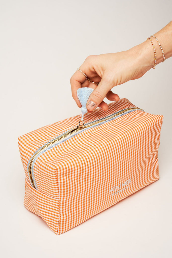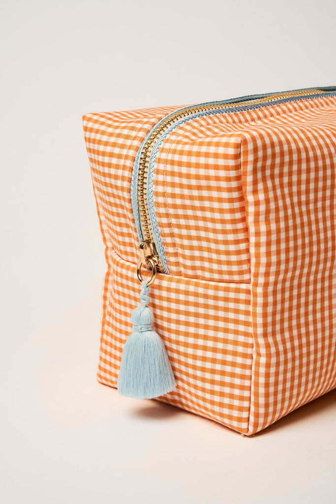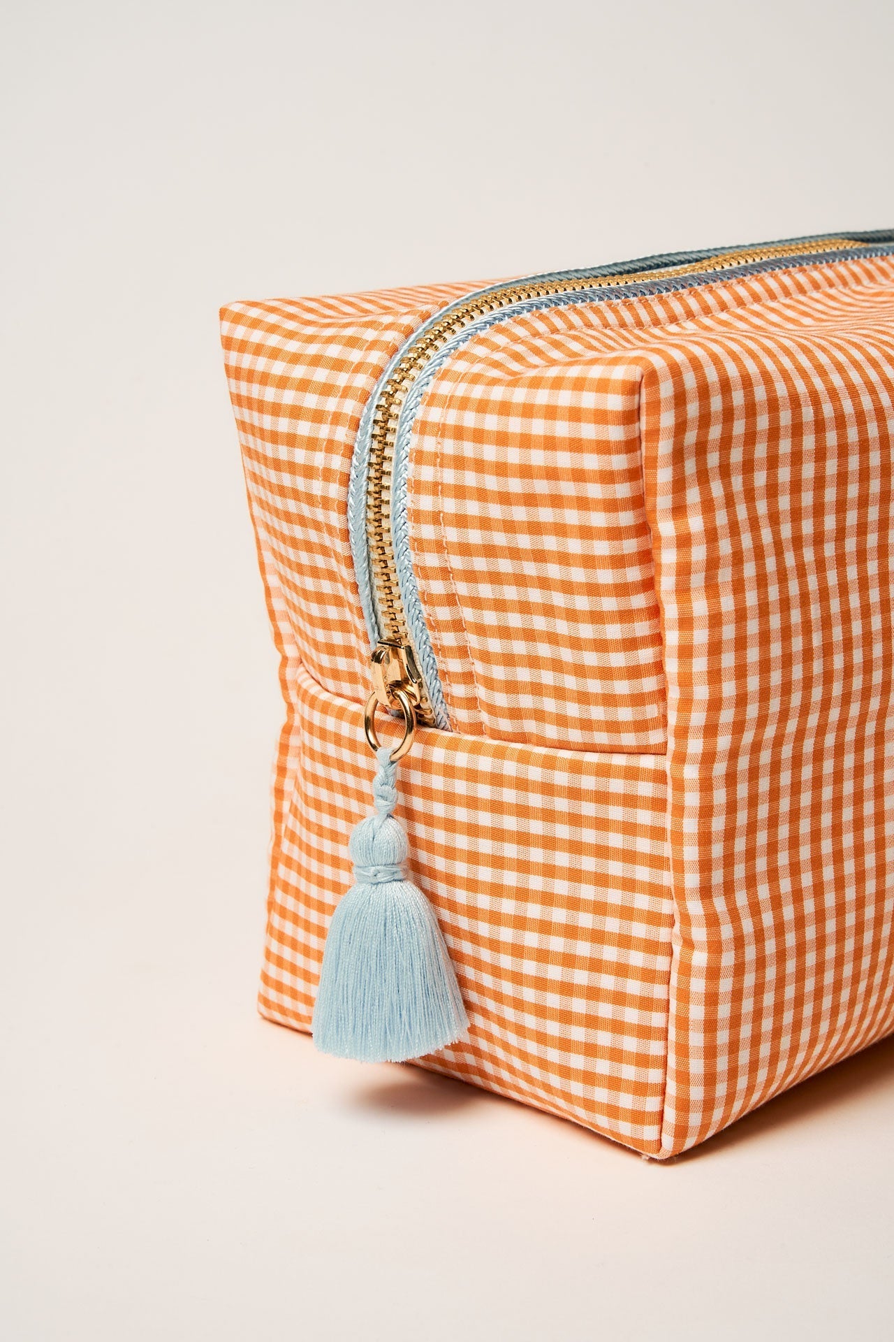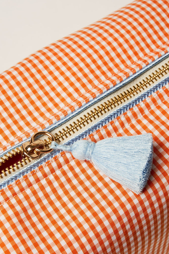 this colorful necessaire is perfectly sized for all your bathroom essentials. it features unique cotton fabrics, a hand-embroidered logo and an intricate border along the zipper. it also has a cute little tassel on the zipper.