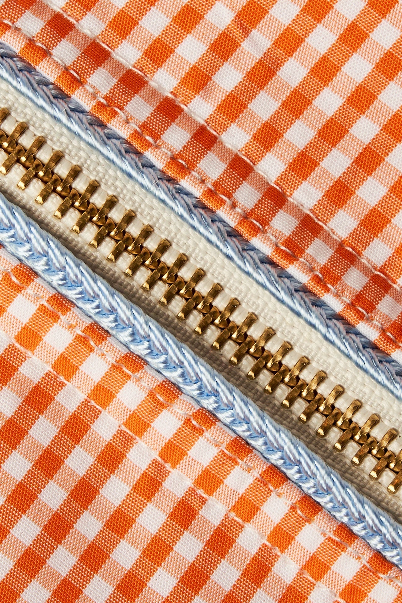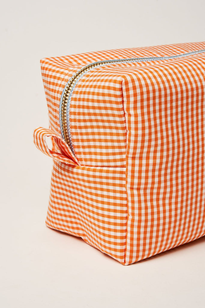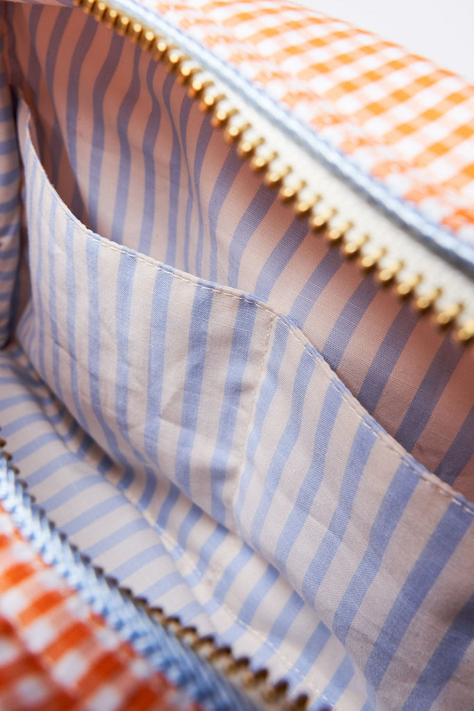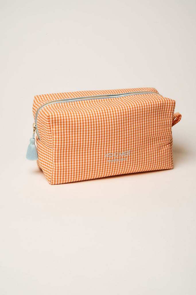 this colorful necessaire is perfectly sized for all your bathroom essentials. it features unique cotton fabrics, a hand-embroidered logo and an intricate border along the zipper. it also has a cute little tassel on the zipper.