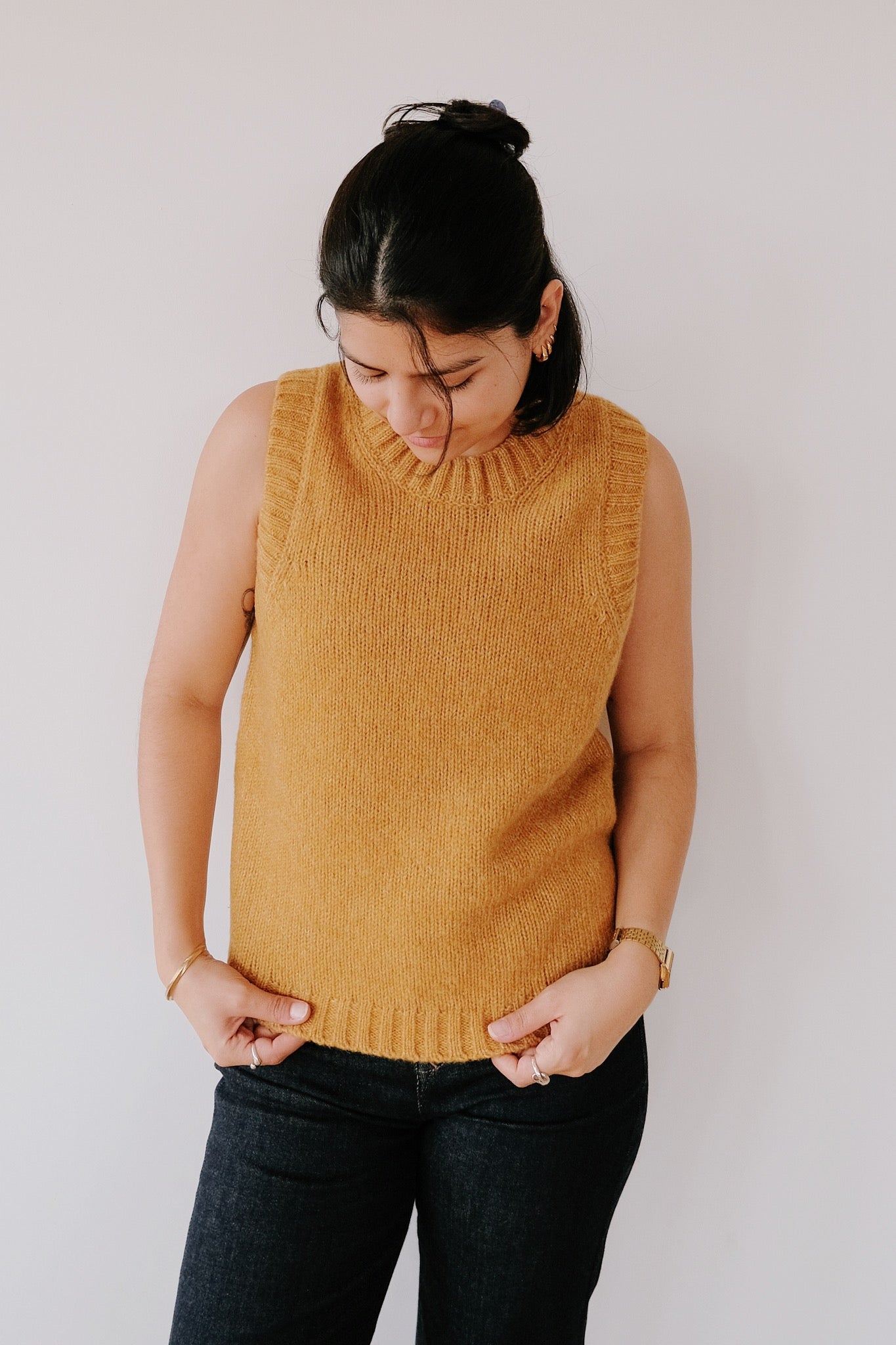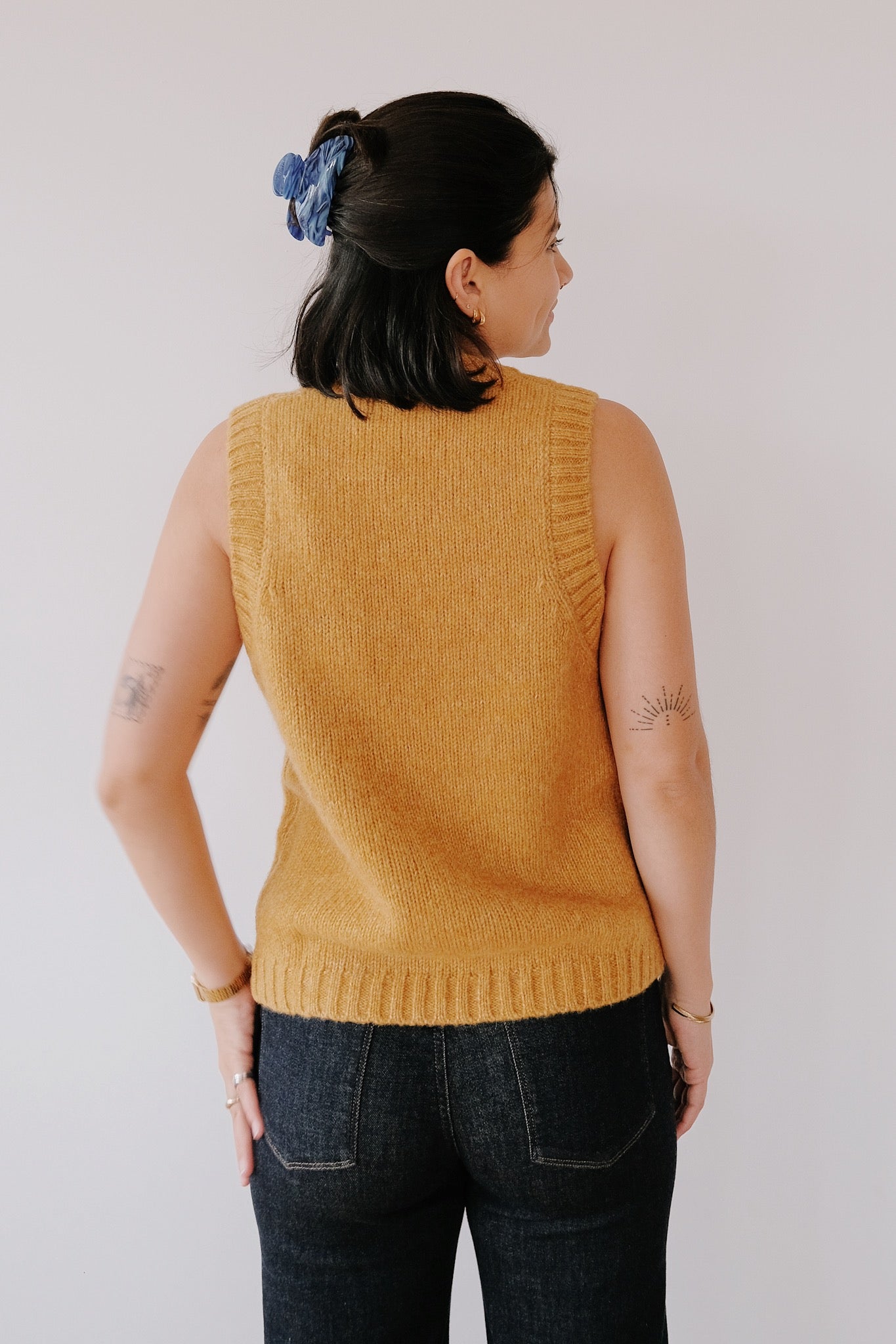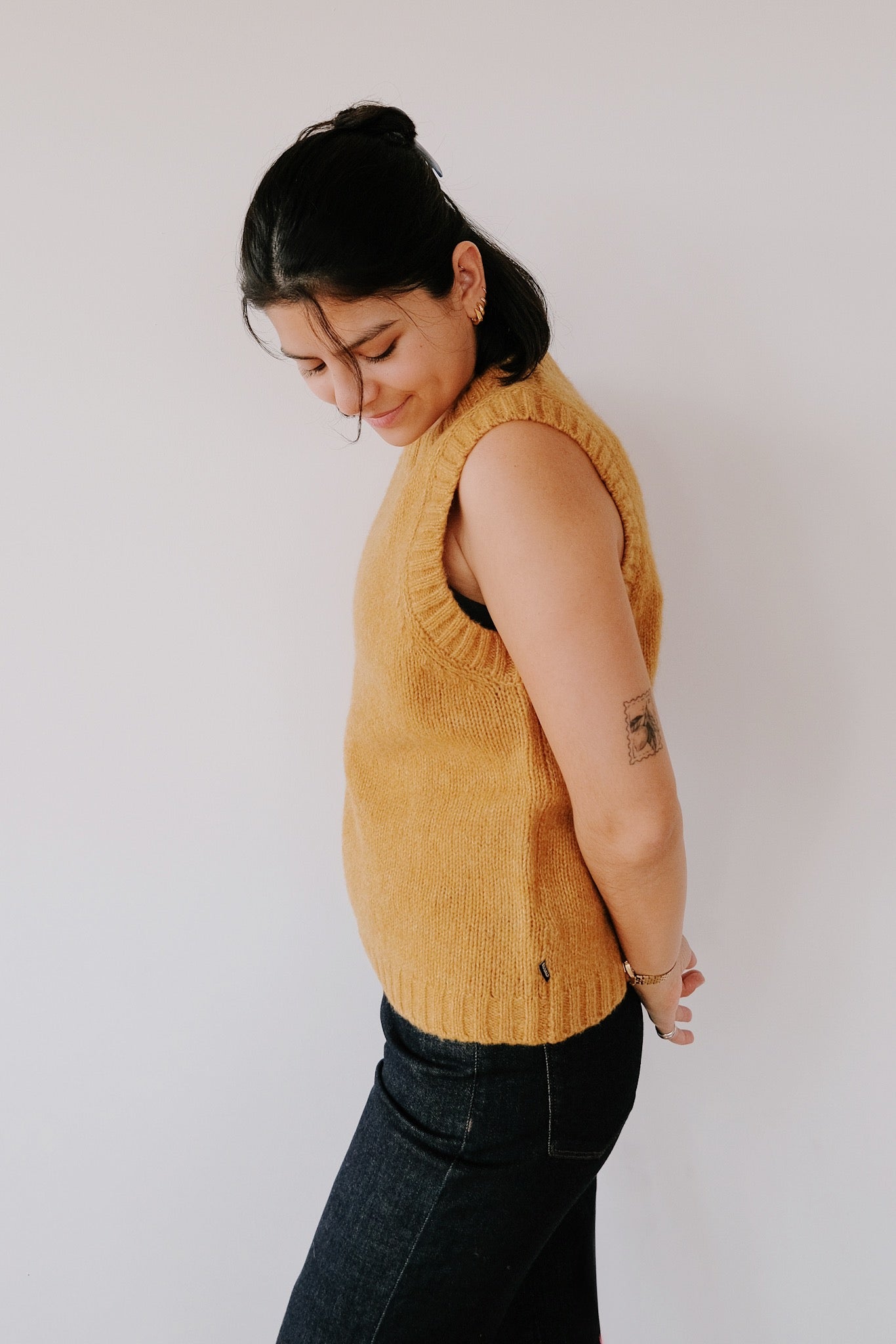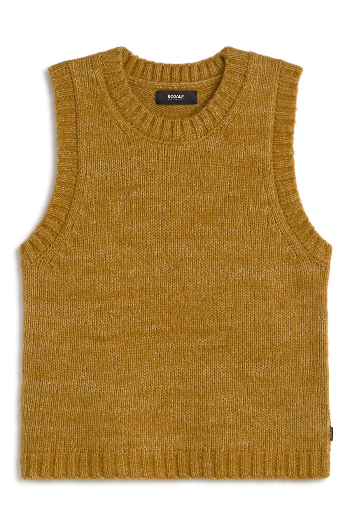 Wrap yourself in cozy vibes with this playful knit vest in a sunny mustard tone. Made from recycled wool and cotton, it’s the perfect mix of comfort and conscious style for wherever your day takes you.