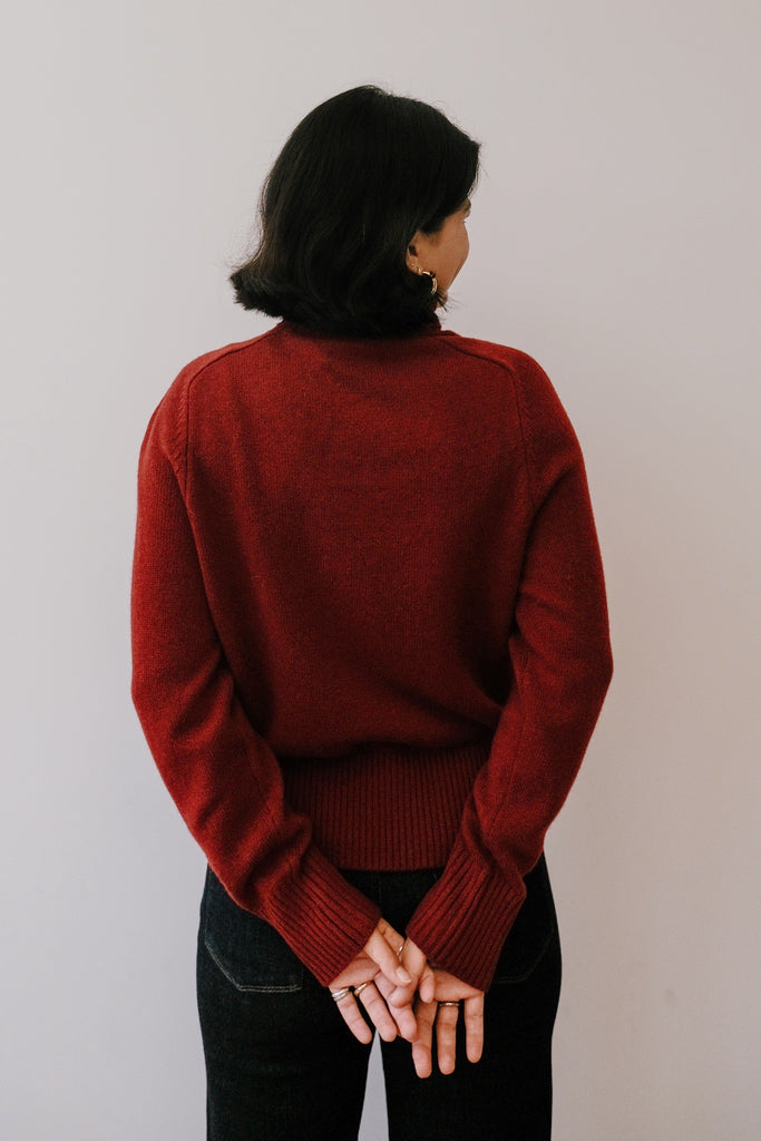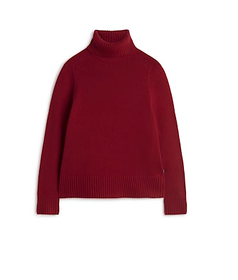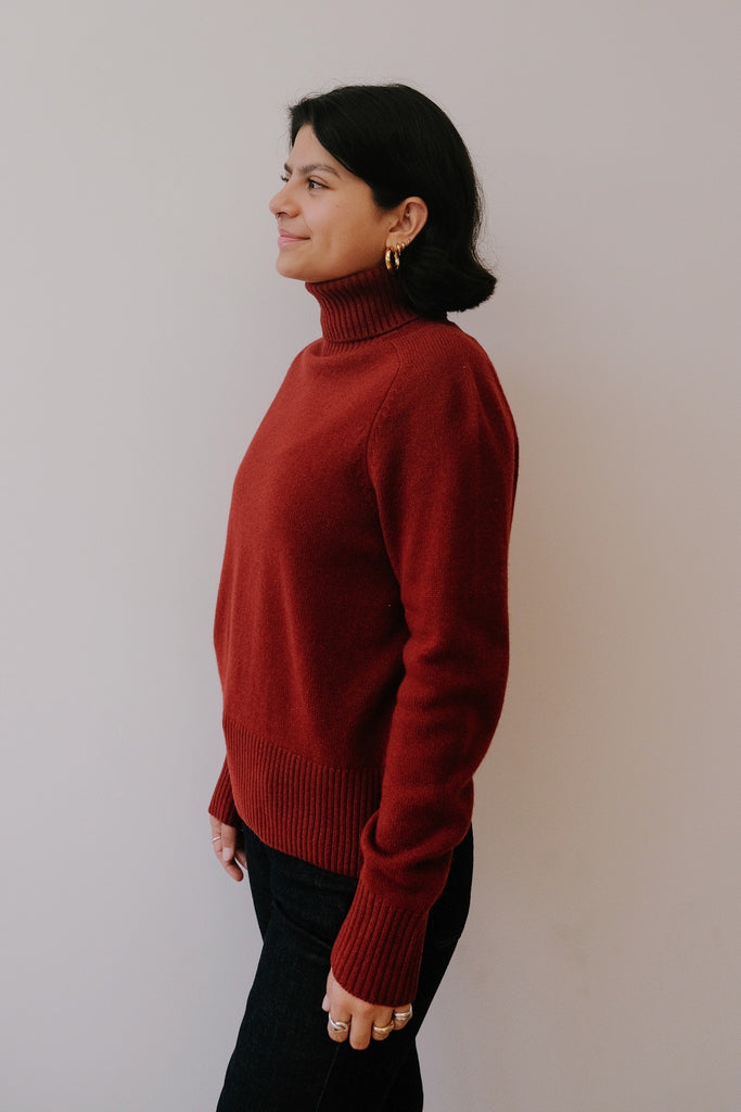 Stay cozy and stylish with this playful knit sweater in a charming caqui red. Crafted from recycled wool, it offers a soft, comfortable feel with a high turtleneck and relaxed fit that adds effortless flair. Perfect for lounging at home, heading to the office, or breezy walks outdoors, this versatile essential brings a fun twist to your everyday wardrobe.