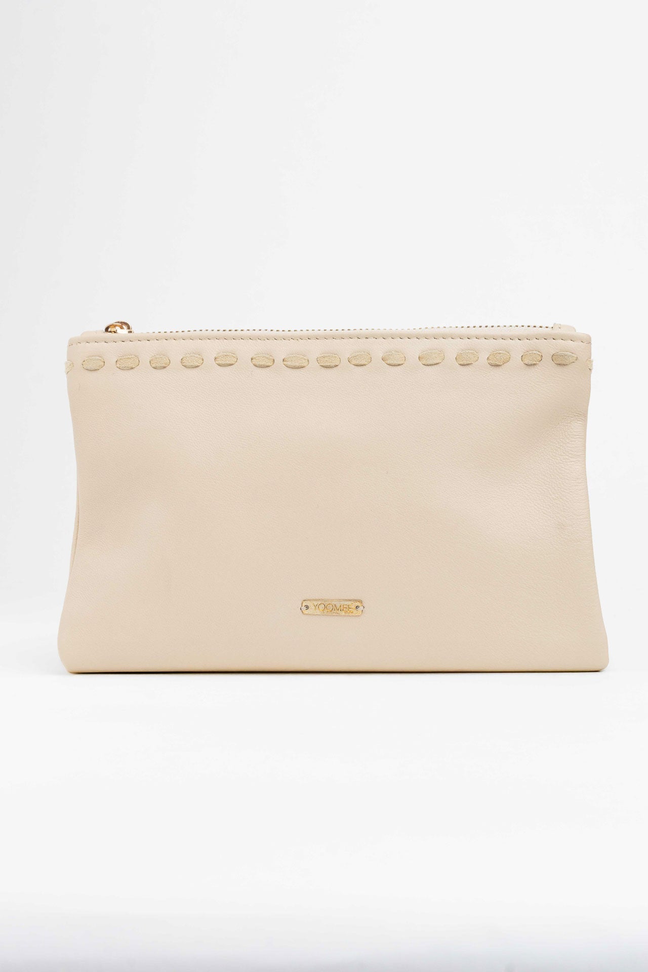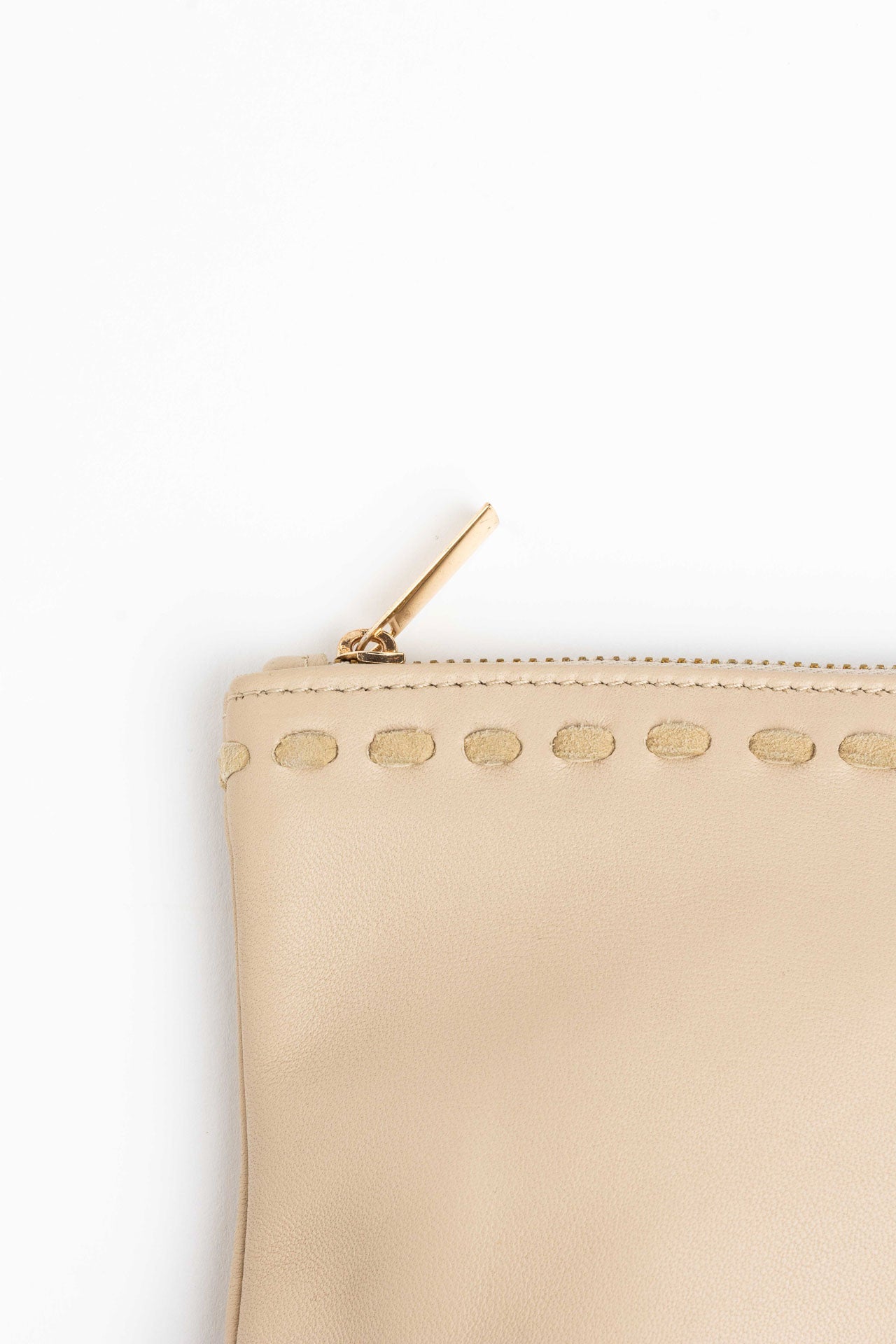 It features delicate hand embroidery and a subtle leather decoration along the brass zipper — a beautiful mix of texture and detail.
