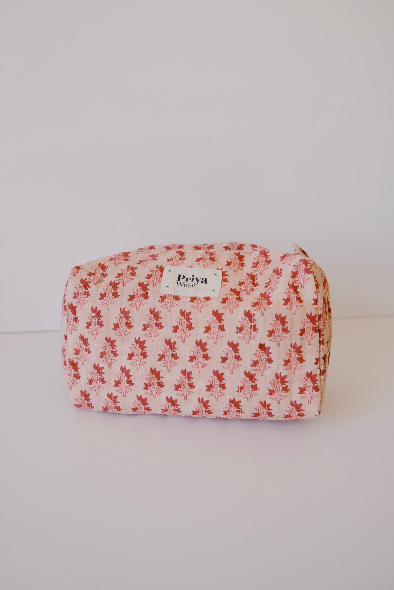 these beauty bags are truly special. they are made from left over fabrics from the priya pyjamas. they are hand block-printed.