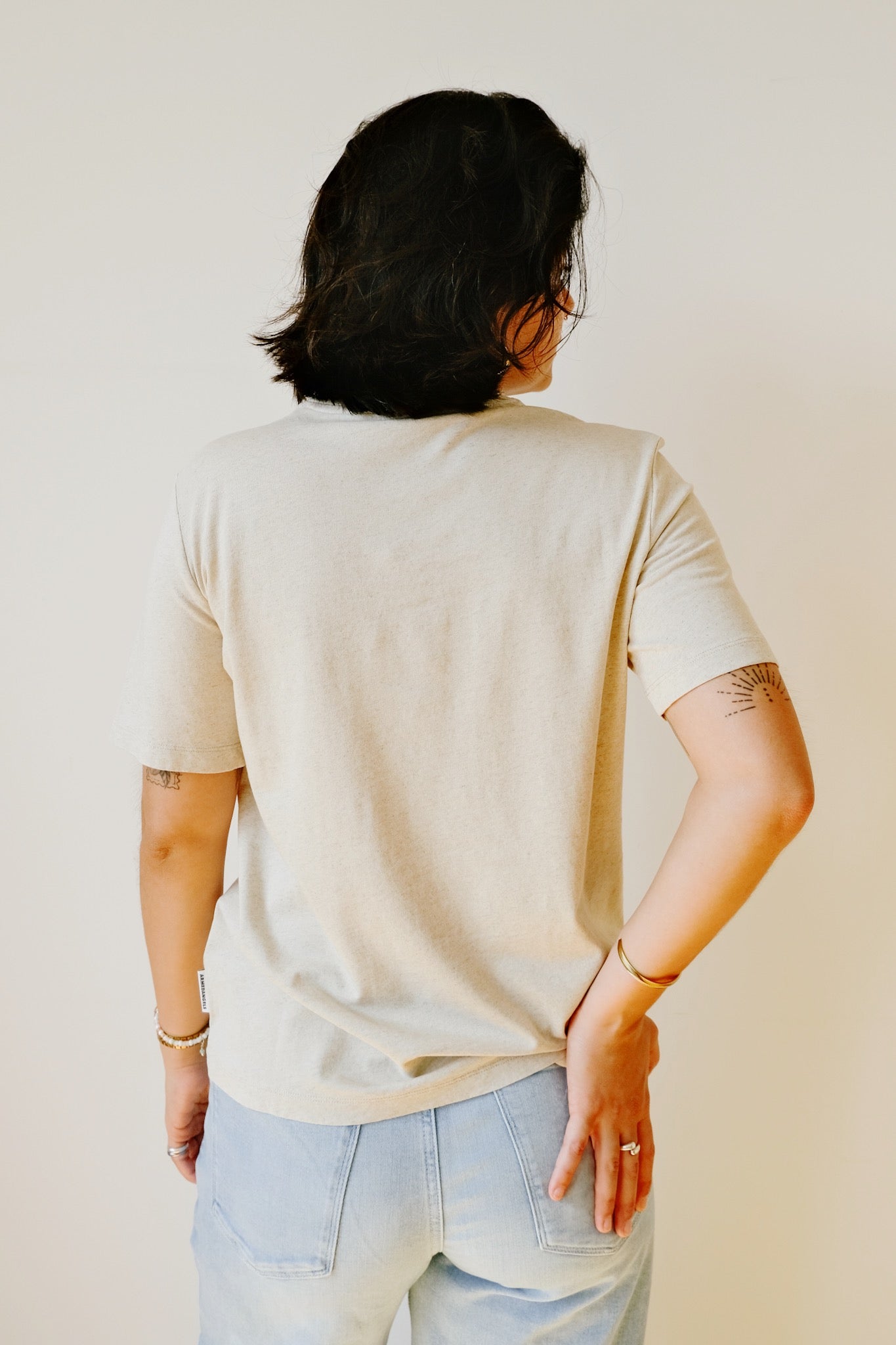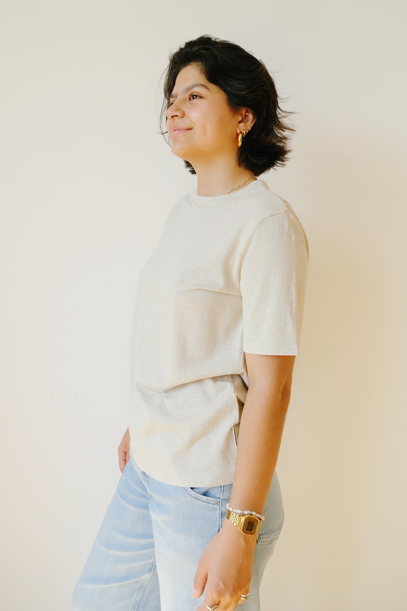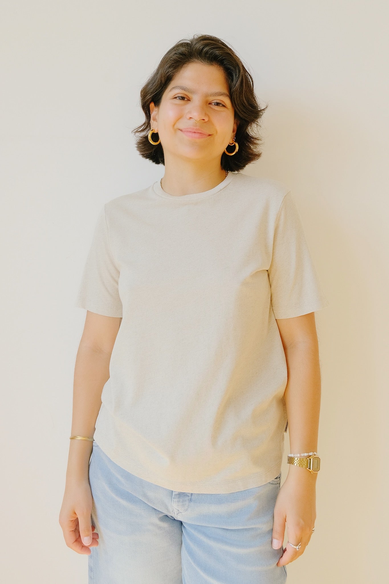 a basic t-shirt with a summer twist! this shirt is perfect for everyday wear on warmer days. made from super soft cotton and linen, this shirt combines style and comfort in one.