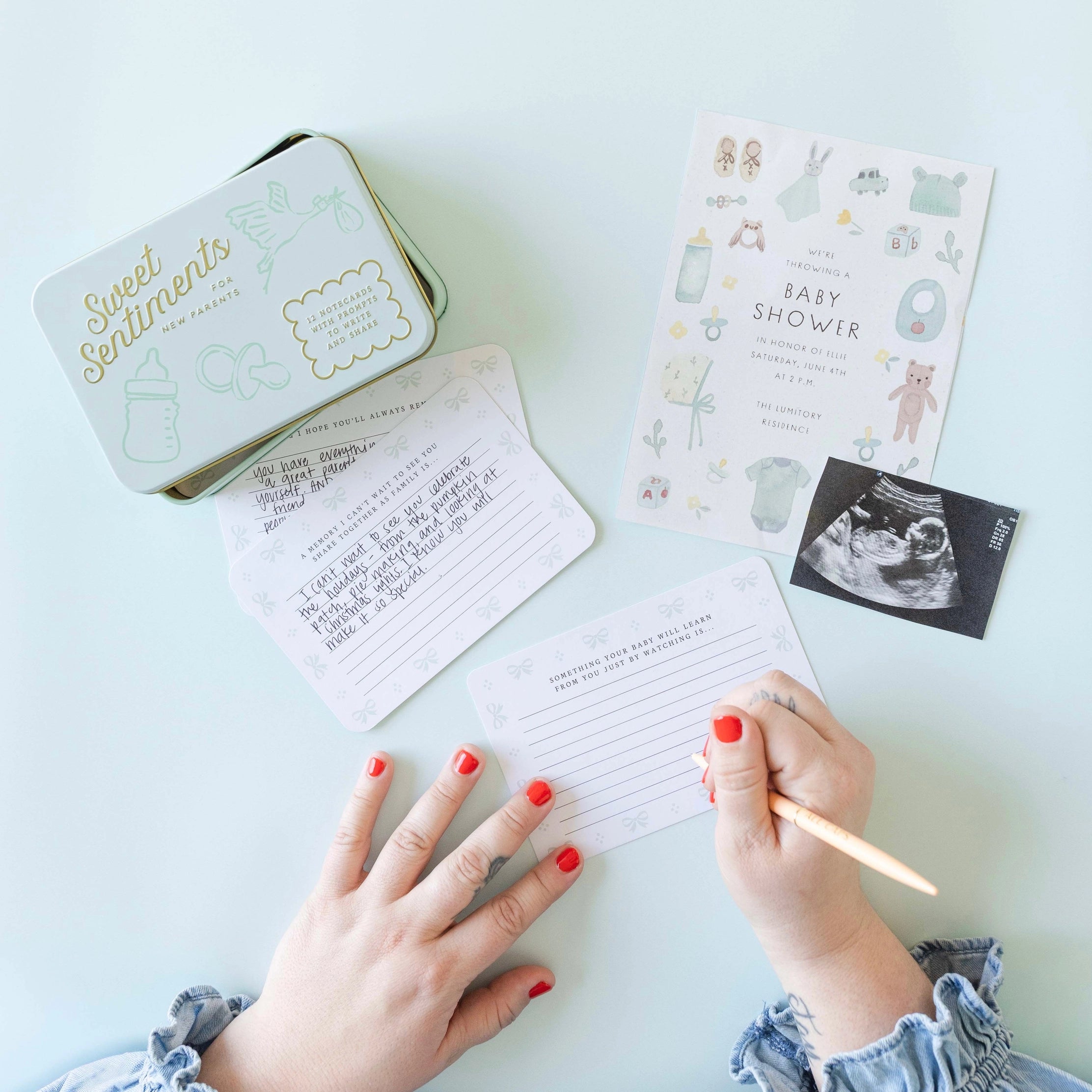 Give new parents a gift that speaks straight to the heart. Sweet Sentiments for New Parents includes 12 beautifully prompted notecards designed to capture love, laughter, and encouragement from the people who matter most. Each card becomes a cherished keepsake—something they'll return to again and again during those transformative early months. A tangible reminder that parenthood is a journey shared with those who care.